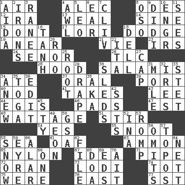 ACROSS 1. Atmosphere 4. Actor Baldwin 8. Lyric poems 12. Lyricist Gershwin 13. Welt 14. Trig term 15. Do not 17. Australian parrot (variant) 18. Evade 19. Approach 21. Compete 23. Big collection agency 24. Sir (Sp.) 26. Affectionate concern, for short 28. Parka part 30. Deli grouping 34. Had dinner 37. Taken by mouth 39. Left side of a ship or aircraft 40. Lower and raise head in agreement 41. Proceeds 43. Area sheltered from the wind 44. Armor plate that protects the chest 46. Writing tablets 47. Eastern Standard Time (abbr.) 48. Electrical Measurement 51. Disorderly outburst 54. Affirmative reply 55. Snout, nose 58. Ocean 61. Clumsy lout 63. ID or VA city 65. Thermoplastic polyamide 67. It may be bright or harebrained 71. Corncob 72. Northwest Algerian city 73. Farming town in central California 74. Small child 75. We are 76. Compass direction 77. Fast jet (abbr.) DOWN 1. Opera by Verdi 2. Removes the wrinkles 3. Indian princess (variant) 4. Leather borer 5. Lion 6. Ewer handle 7. 154 in Roman numerals 8. Bear (Spanish) 9. "You Light Up My Life" star Conn 10. Engineer (abbr.) 11. Observes 16. Hyperbolic tangent 18. Small valley 20. Friend of Pooh 22. Call ___ day 25. Carrot, for example 27. Head covering 29. Window treatment 30. Bobsleighs 31. Undercover agent 32. Angers 33. Proofreading order 34. Afresh 35. Ancient Roman robe 36. Prepare for publication 38. Alias (abbr.) 42. Fast planes 45. Filthy place 49. Age 50. Girls' org. (abbr.) 52. _ tizzy (2 wds.) 53. Play 56. Leaves out 57. Traditional theme or motif 58. Overwhelm 59. Jane of fiction 60. Having or resembling wings 62. Do some clerical work 64. Remaining after all deductions 66. Single 68. ___ good deed 69. Begley and Asner 70. Small island