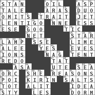 ACROSS 1. Comedian Laurel of Laurel & Hardy 5. Petroleum 8. Cleo's killer 11. Falsehood 12. Ancient river in northeast Turkey 14. Superhero pair 15. Leaves out 17. Distinguishing feature 18. _ stream 19. Small, flat, pigmented spot on the skin 21. Compass dir. 22. Double-curved letter 23. Compass dir. 24. Thick or sticky substance 25. Nervous spasm 27. Fish or hair follower 28. Play the lead 31. Desk light 35. Compass dir. 37. Welles in "The Third Man" 38. Toward shelter 39. Affirmative reply 41. Nights before holidays 42. Charged atoms 43. Tired old horse 45. Portable shelter 46. Make new 47. Make lace 49. White ___ sheet 51. Shoshoni 52. Ocean 55. The grampus (Milton) 57. A female animal or person 60. Thinks logically 62. Luau course 63. Japanese brewing company 65. Table seasonings 66. Small child 67. Came down and settled, as after flight 68. It may be bright or harebrained 69. Filthy place 70. French article 71. Dormintory (informal) DOWN 1. Took without asking 2. Domesticates 3. Place in a line 4. Remaining after all deductions 5. Boat paddle 6. SW Asia republic 7. (Had) reclined 8. Descriptive word 9. Institutes legal proceedings 10. Cooking vessels 13. Proofreading order 16. Attach a signature 17. Tootsie (variant) 20. Leaves 26. Small island 29. So be it 30. Take ten 31. Den 32. _ vera 33. Ananias' fault 34. Mexican monetary units 36. Car or cant ending 40. Titan orbits this 44. Yard entry 48. Beverages made from leaves 50. "____ silly question..." 52. Twentieth part of a lira 53. Keyboard key 54. Indian state 55. Chooses 56. Carrot, for example 58. Land elevation 59. 4th largest of the Great Lakes 61. Alleged 64. ___ a Wonderful Life