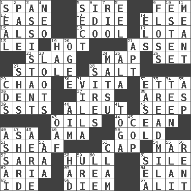 ACROSS 1. Connect, as a bridge 5. Father 9. Opposite of masc. 12. Relaxation 13. Singer Brickell 14. Otherwise 15. In addition 16. Calm and collected 17. Globular water bottle used in Asia 18. Flowery wreath 19. Being at a high temperature 21. NE Netherlands city 22. Volcanic refuse 24. Atlas unit 26. Arrange properly for use 27. Fur scarf 28. Table seasoning 29. US Secretary of Labor Elaine L. _ 30. Webber/Rice musical 32. Singer James 36. Gouge 37. Big collection agency 38. Ancient Greek god of war 39. Fast planes 40. Native American of Southwest Alaska 42. Ooze 43. Petroleums 44. Sea 46. White ___ sheet 49. Wet nurse (var.) 50. Gilded 51. To gather and bind into a bundle 53. Head covering 54. Third mo. 57. "Two Mules for Sister ____" 58. Frame or body of a ship 61. Drop; flow; fall 62. Operatic vocal solo 63. Type of rug 64. Flair 65. Binary compound 66. South Vietnam president (1954) 67. Came down and settled, as after flight DOWN 1. Lick closed 2. Light colored 3. Aide 4. Modern: prefix 5. Religious group 6. Wedding promise 7. River (Sp.) 8. Snakelike fish 9. Soft thread for cleaning between teeth 10. First name in cosmetics 11. Intended 14. Raised railways 19. Actor Linden 20. Double curve, resembling the letter S 21. Fitting 23. Plunders 24. Taiwanese island in East China Sea 25. According to 27. "______ My Girl" (Turtles hit) 28. Titles for men of rank and authority 29. Music discs 31. Country residence 32. Artist's stand 33. Excercise machine 34. Adolescent 35. Viper 40. Direct toward a target or goal 41. Ancient Roman robe 43. Clumsy lout 45. Police officer (slang) 46. Slender Brazilian palm 47. Broken piece 48. Nest on high 52. American Automobile Association (abbr.) 53. Dollar (slang) 55. Mountain range southwest of Kyrgyzstan 56. Monthly bill 58. Possessed 59. RI univ. 60. Area sheltered from the wind 61. Ocean
