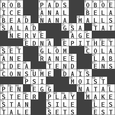 ACROSS 1. Director Reiner 4. Groovy apts. 8. Mitch Miller's instrument 12. Frozen water 13. Of or related to the anus 14. Actor Lugosi 15. Necklace unit 17. Nanny 18. Promenades 19. Vegetable dish 21. Girls' org. (abbr.) 23. Make lace 24. Effrontery 26. Ripen 28. Pulitzer Prize-winning author Ferber 30. Curse 34. Arrange properly for use 37. Take by theft 39. Root beer relative 40. One (Scot) 41. Indian princess (variant) 43. Experiment locale 44. The main thing one is thinking about 46. Be inclined (to) 47. Followers of ems 48. Eat 51. Raised platform 54. 23rd letter of the Greek alphabet 55. Damp 58. Fenced enclosure 61. Ovum 63. Brizilian seaport 65. Bull 67. Frolic 71. Cause to be 72. Comedian Laurel of Laurel & Hardy 73. Filth; sediment 74. French article 75. Story 76. Puts into a specified state 77. Eastern Standard Time (abbr.) DOWN 1. Chest bones 2. Sea 3. Calif. Air Force Base 4. Baking dish 5. Santa ___, CA 6. Daniel's nick name 7. Volcanic refuse 8. Chief or king in Benin or Nigeria 9. Waist strap 10. Rounded earthenware pot or jar 11. Compass direction 16. Have the gumption 18. Wise men 20. Movie disc 22. Plant excrement 25. Engineer (abbr.) 27. And so on (abbr.) 29. Having winglike extensions 30. Make improvements or corrections to 31. Hollow 32. Style 33. Bar bills 34. Ketch in the Levant 35. Inside; within (prefix) 36. Adolescent 38. Single 42. Dutch treat 45. Viper 49. One who uses or employs something 50. Russian fighter aircraft 52. Electrically charged atom 53. Thailand, formerly 56. Lacking originality or spontaneity 57. Receives possession of 58. Inconspicuous attention getter 59. Singer James 60. Be tempered by heat 62. Global Positioning Systems (abbr.) 64. For fear that 66. Compass dir. 68. Falsehood 69. Keyboard modifier key 70. Consenting reply