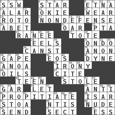 ACROSS 1. Compass dir. 4. Play the lead 8. Inactive volcano in Sicily 12. Having or resembling wings 14. Migrant worker of the '30s 15. Erode 16. Printing process, for short 17. Unrelated to defense, as in spending 20. Collude with 21. Rowing implement 22. Parent Teacher Association (abbr.) 23. Indian princess (variant) 27. Carry 29. Snakelike fish 31. Southwest Nigerian state 34. 2nd pers. sing. pres. of can (arch.) 35. Soon (poet.) 36. Stare wonderingly 39. Greek goddess of the dawn 41. Unit of force 42. Small Philippine buffalo 43. Literary sarcasm 46. Lubricates 47. Quote 48. Adolescent 51. Fur scarf 54. Slender fish 56. Allow 58. Against 61. Conciliate 66. Astrian river, tributary to the Danube 67. Portico 68. Nuclear Threat Initiatives 69. Naked 70. Post 71. Religious group 72. Curvy letter DOWN 1. "Two Mules for Sister ____" 2. Oscar Madison type 3. Wetness 4. Male offspring 5. Ring climax 6. The 18th letter of the Arabic alphabet 7. Redecorate 8. She-sheep 9. 3-inch nail 10. Political cartoonist Thomas 11. Length times width 13. Round or rotation of duties 18. Ingest 19. Back 24. Teachers' org. 25. Car or cant ending 26. Otherwise 28. Sycophant 30. Unemotional 32. Spanish title 33. Single 34. Desist 36. E Mali city 37. Cuckoo 38. Characterized by complete cowardliness 40. Indian titles of respect 44. Baseball player Mel 45. Modern: prefix 49. Biblical high priest 50. Fish or hair follower 52. (Had) reclined 53. Take place subsequently 54. Global Positioning Systems (abbr.) 55. Johnson of "Laugh-In" 57. Metal containers 59. Small amounts or degrees 60. Angers 62. Writing tablet 63. Had dinner 64. Nervous spasm 65. Eastern Standard Time (abbr.)