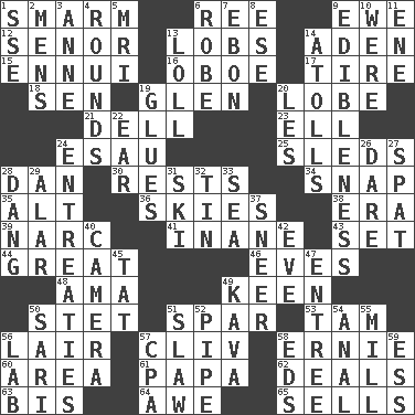ACROSS 1. Excessive but superficial compliments 6. To riddle 9. She-sheep 12. Sir (Sp.) 13. Tennis shots 14. An important port of Yemen 15. World-weariness 16. Mitch Miller's instrument 17. Become fatigued 18. Elected rep. 19. Small, secluded valley 20. Ear part 21. Small valley 23. Pipe bend 24. He sold his birthright 25. Bobsleighs 28. One of the 12 tribes of Israel 30. Musical pauses 34. Fastener 35. Keyboard modifier key 36. Atmospheres 38. Epoch 39. Drug cop 41. Lacking in sense or substance 43. Put into a specified state 44. Relatively large 46. Nights before holidays 48. Wet nurse (var.) 49. Peachy ____! 50. Proofreading order 51. Coast Guard woman 53. Scottish cap 56. Den 57. 154 in Roman numerals 58. Bert's buddy 60. Length times width 61. Dad 62. Allots cards 63. Twice 64. Deep reverence 65. Makes a sale DOWN 1. Compass dir. 2. Not women's 3. Singer Murray 4. Periods in a boxing match 5. Medical imaging device (abbr.) 6. Loose flowing garment 7. Inky black, to poets 8. Compass dir. 9. The property of being fit to eat 10. We are 11. Compass dir. 13. Hang loosely or laxly 14. Ringlike coral islands and reefs 19. Cements 20. French article 22. Hearing organ 24. Pleas 26. Have the gumption 27. Petty quarrel 28. Mild oath, euphamism for damn 29. Having or resembling wings 31. What Jean-Claude Killy likes to do 32. Shallow baking pan 33. Ocean 37. Contemptuous expression 40. Device for capturing images 42. Night before a holiday 45. Make lace 47. Main course 49. Polynesian shrub of the pepper family 50. Indian skirt 51. Cole _ (cabbage dish) 52. Corncob 54. Of or related to the anus 55. Place where flour is made 56. Experiment locale 57. Numbers guy (abbr.) 58. Begley and Asner 59. Double-curved letter