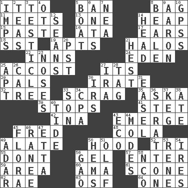 ACROSS 1. "Tell ____ the Marines!" 5. Bar 8. Paper or plastic container 11. Confronts 13. Single 14. Pile 15. Thick mixture 16. _ moment's notice (2 wds.) 17. Hearing organs 18. Fast jet (abbr.) 19. Tenement units (abbr.) 21. Auras 22. Restaurants 24. Locale of original sin 25. Buttonhole 27. It is 29. Friends 30. Feeling or showing extreme anger 32. Relationship diagram 33. Lean end of the neck 35. "____ silly question..." 39. Halts 41. Proofreading order 42. _ tizzy (2 wds.) 43. Develop 45. Flintstone 48. Root beer relative 49. Having winglike extensions 50. Parka part 52. Three (prefix) 55. Do not 56. Set 57. Keyboard key 59. Length times width 60. Nanny (var.) 61. Biscuitlike quick bread 62. Actress Charlotte 63. Order of Saint Francis (abbr.) 64. Singles DOWN 1. Naughty children 2. Beverages made from leaves 3. One of the two male reproductive glands 4. Baseball player Mel 5. Water vessel 6. Pismires 7. Teachers' org. 8. Memphis, Tenn. Street 9. Composer Copland 10. Global Positioning Systems (abbr.) 12. Actors Connery and Penn 14. Froth on beer 20. Pacific Standard Time (abbr.) 21. Command 23. Olfactory organs 25. Fitting 26. Auto 27. Lyricist Gershwin 28. Label 30. Big collection agency 31. Artist's stand 33. Male child 34. Tax preparer (abbr.) 36. Ski resort town in Vermont 37. Barrel 38. Had dinner 40. Periodic rise and fall of the sea level 43. Environmental prefix 44. Methods 45. Plants 46. Indian princess (variant) 47. Singer James 49. The sixth month of the Jewish calendar 50. Folds over and sews together 51. Norwegian king 53. French philosopher Descartes 54. Angers 56. E Mali city 58. Non-commissioned officer (abbr.)