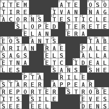 ACROSS 1. A whole individual unit 5. Had dinner 8. Bear (Spanish) 11. Hoop that covers a wheel 12. _ the terrible 13. Tired old horse 14. Oak nuts 17. A testis 19. Had an oblique or slanted direction 21. Cylindrical with tapered ends 22. Flair 23. Period 24. Greek goddess of the dawn 27. Pismires 29. Keyboard key 32. Believer in; advocate of (suffix) 34. Actress Charlotte 36. Diluted with white 37. Droops 38. Raised railways 39. Silent film actress Nazimova 40. Inactive volcano in Sicily 41. And so on (abbr.) 42. Standard of perfection 43. French article 44. Without 46. A female animal or person 47. Parent Teacher Assoc. 50. Cause heat under the collar 52. A viewer who gazes fixedly 55. Become visible 57. Newsperson 59. Disco prop 62. It is 63. Drop; flow; fall 64. Nights before holidays 65. Observe 66. Snakelike fish 67. Cub Scout units DOWN 1. Call ___ day 2. Nervous spasm 3. Greek god of love 4. Haggard of country music 5. "___ Maria" 6. Clothes sense 7. Keyboard key 8. Single time 9. Table seasoning 10. Double curve, resembling the letter S 12. It would 15. Pitcher Ryan 16. Connect, as a bridge 18. Lyricist Gershwin 20. Main course 24. Artist's stand 25. Speak pompously 26. Public displays of written messages 28. Table seasonings 29. Stories 30. Assad's deity 31. Memphis, Tenn. Street 33. White ___ sheet 35. Fortification 36. Writing tablet 42. Small island 45. Cuts off 47. Adept person 48. Laconic 49. Nick name for Arthur 51. Having ears or earlike features 52. Indian titles of respect 53. Wig 54. Domed church section 55. "We ___ not amused" (Victoria) 56. Be footloose 58. Pipe bend 60. Benjamin's nick name 61. Double-curved letter