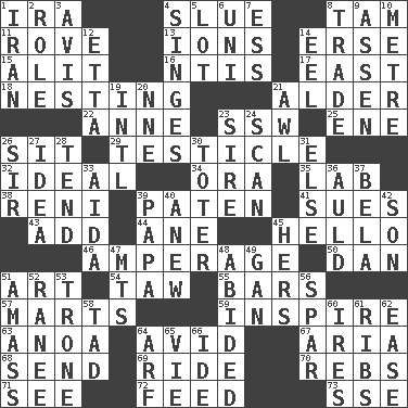 ACROSS 1. Lyricist Gershwin 4. Change direction abruptly 8. Scottish cap 11. Be footloose 13. Charged atoms 14. Celtic language 15. Set down 16. Nuclear Threat Initiatives 17. Compass direction 18. Snuggling 21. Tree or shrub in the Birch family 22. Singer Murray 23. Compass dir. 25. Compass dir. 26. Be seated 29. A testis 32. Perfect 34. Mouth or opening 35. Experiment locale 38. Painter Guido (1575-1642) 39. Eucharist need 41. Takes to court 43. Find the sum of 44. One (Scot) 45. Phone greeting 46. Electrical Measurement 50. Daniel's nick name 51. Nonscientific branch of learning 54. The 23rd letter of the Hebrew alphabet 55. Drinking establishments 57. Shops 59. Motivate 63. Small Philippine buffalo 64. Enthusiastic 67. Operatic vocal solo 68. Transmit 69. Travel on an animal 70. Confederate soldiers (slang) 71. Perceive with the eye 72. Nourish 73. Compass dir. DOWN 1. SW Asia republic 2. Hero or heavy, e.g. 3. Deliberation 4. Scorches 5. Car dealer's back yard 6. Corn or form start 7. Curvy letter 8. Buy and sell 9. NE Netherlands city 10. Distance measurement (Brit.) 12. Singer James 14. Snakelike fish 19. International (abbr.) 20. Compass dir. 21. Leather borer 23. Title for a man of rank and authority 24. Glance over 26. Title for a knight 27. It may be bright or harebrained 28. Be inclined (to) 30. Carrier 31. Otherwise 33. Opera by Verdi 36. Old (Scot.) 37. Actor Lugosi 39. Dad 40. Afresh 42. Manchild 45. Possessive pronoun 47. Mountains (abbr.) 48. Stayed 49. Separate the seeds from cotton 51. Collect or gather 52. Indian princess (variant) 53. Heavy duty weighing machine 56. Practice fight 58. Small amount or degree 60. Angers 61. Teases 62. Relaxation 64. Sandy's bark 65. Compete 66. Binary compound