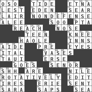 ACROSS 1. Bear (Spanish) 4. Periodic rise and fall of the sea level 8. Inactive volcano in Sicily 12. For fear that 14. Genesis locale 15. Singe 16. Den 17. Unrelated to defense, as in spending 20. Toward shelter 21. "Barney Miller" actor Jack 22. Parent Teacher Association (abbr.) 23. Arrive at 27. Sense of smell 29. Adolescent 31. Leg joint 34. White Person, in Hawaii 35. Taverns 36. Helper 39. Before (prefix) 41. Sight organs 42. Slanted text style (abbr.) 43. Flower holders 46. "Change" in Tahitian 47. Celtic language 48. Travels 51. Sir (Sp.) 54. Quiet! 56. "We ___ not amused" (Victoria) 58. The longest river in the world 61. Producing rotation 66. Prepare for publication 67. Angers 68. 4th largest of the Great Lakes 69. Transmitted 70. "Two Mules for Sister ____" 71. Plant excrements 72. Ocean DOWN 1. Rounded earthenware pot or jar 2. Lick closed 3. Flexible twig of a willow tree 4. Nine, plus one 5. Wedding promise 6. Lair 7. Extremities 8. Compass dir. 9. 3-inch nail 10. Political cartoonist Thomas 11. Type of rug 13. Family _ (genealogy) 18. Age 19. Egg _ yung 24. "One Day ___ Time" 25. Corporate head (abbr.) 26. Assist 28. Atmospheres 30. Impudent aggressiveness 32. Compass dir. 33. Double-curved letter 34. Sun: prefix 36. Small island 37. Call ___ day 38. Female offspring 40. Hearing organs 44. Compass dir. 45. Car or cant ending 49. Consume 50. _ Lanka 52. Washington bills 53. Amusement-park features 54. Indian titles of respect 55. Israeli folk dance 57. Nights before holidays 59. Actor's bit 60. Singer James 62. White ___ sheet 63. Epoch 64. Mouth edge 65. Consenting reply
