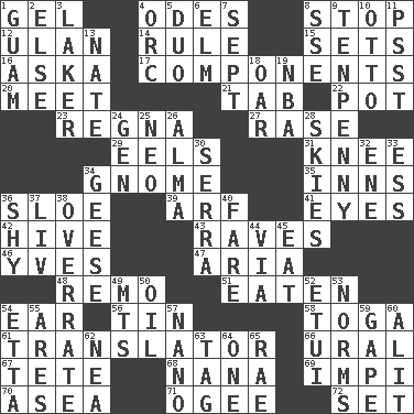 ACROSS 1. Set 4. Lyric poems 8. Discontinue 12. Uhlan (variant) 14. Governing power 15. Puts into a specified state 16. "____ silly question..." 17. Pieces 20. Confront 21. Keyboard key 22. Cooking vessel 23. Rain (Swedish) 27. Raze (variant) 29. Snakelike fish 31. Leg joint 34. Dwarf 35. Taverns 36. _ gin 39. Sandy's bark 41. Snake ____ (dice throw) 42. Hub of activity 43. All-night dance parties 46. Jacques Cousteau's middle name 47. Operatic vocal solo 48. San ____ (Riviera town) 51. Ingested 54. Ewer handle 56. Shallow baking pan 58. Ancient Roman robe 61. Interpreter 66. Mountain range 67. Wig 68. Grandmother 69. Body of Kaffir warriors 70. Toward the sea 71. Double curve, resembling the letter S 72. Arrange properly for use DOWN 1. Island territory of the United States 2. Otherwise 3. Member of a famous L.A. basketball team 4. The grampus (Milton) 5. Superhero pair 6. Shade tree 7. Back-to-school mo. 8. Compass dir. 9. 3-inch nail 10. "Beetle Bailey" pooch 11. Inconspicuous attention getter 13. Nathan's nickname 18. Boat paddle 19. Basketball assoc. 24. Commissioned mil. rank 25. Modern: prefix 26. _ mater 28. Atmospheres 30. Spanish missionary in California 32. Compass dir. 33. Double-curved letter 34. Honkers 36. Like a shrinking violet 37. 54 in ancient Rome 38. Make much ado about nothing 40. Conductor's collection 44. By way of 45. Ingest 49. Mountains (abbr.) 50. Lubricate 52. Needle case 53. Typical standards 54. Singer James 55. Ancient Greek god of war 57. Billionth: prefix 59. Open wide 60. Came down and settled, as after flight 62. Teachers' org. 63. Label 64. Single 65. Actress Charlotte