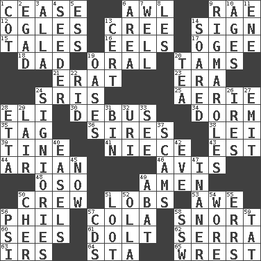 ACROSS 1. Desist 6. Leather borer 9. Actress Charlotte 12. Stares at amorously 13. Algonquian 14. Omen 15. Stories 16. Snakelike fish 17. Double curve, resembling the letter S 18. Male parent 19. Spoken 20. Scottish caps 21. Part of Q.E.F. 23. Period 24. Indian titles of respect 25. Nest on high 28. Biblical high priest 30. Alight from a bus 34. Dormintory (informal) 35. Label 36. Titles for men of rank and authority 38. Flowery wreath 39. Prong on a fork 41. Sibling's daughter 43. Eastern Standard Time (abbr.) 44. Believer in; advocate of (suffix) 46. Deliberation 48. Bear (Spanish) 49. So be it 50. Ship's personnel 51. Tennis shots 53. Deep reverence 56. Silvers or Donahue 57. Root beer relative 58. Derisive sound 60. Observes 61. Dunce 62. Spanish missionary in California 63. Big collection agency 64. R.R. building 65. Take or capture by force DOWN 1. Small bed 2. Mild oath 3. Silent film actress Nazimova 4. Sowing specialist 5. Double-curved letter 6. Length times width 7. Not ill 8. French article 9. Frustrating wastes of time 10. Ripens 11. Compass dir. 13. Foregone conclusion 14. Flew 19. Fertile tracts in a desert 20. Afternoon social gathering 22. To free from 24. Seigniories (variant) 26. Angers 27. Send forth 28. Singer James 29. Den 31. Storage container 32. RI univ. 33. Perceive with the eye 37. Fraudulent business schemes 40. Artist's stands 42. First lady 45. Immediately 47. More lacking in sense or substance 49. Blind as ____ 50. "Mermaids" star 51. Plunder 52. Rounded earthenware pot or jar 54. Had on 55. Blunders 56. Air pressure measure (abbr.) 57. Music discs 58. Compass dir. 59. Make lace