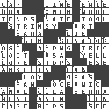 ACROSS 1. Head covering 4. Actor's bit 8. One of the Great Lakes 12. Mouth or opening 13. Presage 14. Connecting point 15. Looks after 18. Nathan's nickname 19. Implement 20. Slender, wiry 22. Tate display 23. "Two Mules for Sister ____" 24. Whopper 25. Commissioned mil. rank 26. Legislator 30. Order of Saint Francis (abbr.) 33. Amid 36. Musical group of three 37. Plunder 39. White ___ sheet 40. Shout 41. Old wives' tales, e.g. 42. Closes up, plugs up 44. Compass dir. 45. Short socks 47. Experiment locale 50. Myrna of the movies 51. Mouths or openings 53. Baking dish 54. Pertaining to the sea 57. Of or related to the anus 59. Root beer relative 61. Father Junipero _ 63. Painter Guido (1575-1642) 64. Afresh 65. Car or cant ending 66. Relaxation 67. Vintage cars 68. Perceive with the eye DOWN 1. Small bed 2. Ancient Greek god of war 3. Leg coverings 4. Protracted 5. "If ____ say so..." 6. Fish or hair follower 7. Compass dir. 8. Plea 9. Carrot, for example 10. Wedding promise 11. Snakelike fish 16. To draw with force 17. Father 21. Grandmother 22. The 18th letter of the Arabic alphabet 24. Part of a journey 26. Fastener 27. Relationship diagram 28. Lubricates 29. Hero or heavy, e.g. 30. Spanish pot 31. Within a short period 32. Tined utensil 34. Floor protectors 35. Bear (Spanish) 38. Copy Pinocchio 42. Filthy place 43. A type of plum 46. Age 48. Ancient river in northeast Turkey 49. Object of repulsion 52. Begets 53. Baking dishes 54. Margarine 55. Crow sounds 56. Algonquian 57. "We ___ not amused" (Victoria) 58. Teachers' org. 59. Auto 60. Single 62. A saturated hydrocarbon