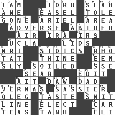 ACROSS 1. Scottish cap 4. "Corrida" creature 8. Thick slice 12. A saturated hydrocarbon 13. Artist's stand 14. Lacquered or enameled metalware 15. Went 17. Satellite of Uranus 18. Length times width 19. Contrary to your interests or welfare 21. Tolerated 23. Atmosphere 24. Lyricist Gershwin 26. Big collection agency 27. Southern CA. univ. 28. Flaplike coverings 30. Medical imaging device (abbr.) 31. Unemotional ones 34. 17th letter of the Greek alphabet 37. Make lace 38. One or ones belonging to thee 39. Car or cant ending 40. Secret 41. Dirtied 42. Compass dir. 43. Wither 44. Prepare for publication 46. Small island 47. Fool 50. Male parent 51. Actresses Bloom and Felton 54. More impudent 57. Cassini of fashion 58. Clothes sense 60. In a ____ (agitated or irritated) 62. Actor's bit 63. Opt 64. Auto 65. Afternoon social gatherings 66. Hyperbolic tangent 67. Connecticut Ivy Leaguer DOWN 1. Label 2. Small Philippine buffalo 3. Ananias' fault 4. Tarsus (plural) 5. Flexible twig of a willow tree 6. To separate or throw off 7. Spanish pot 8. Flight of steps 9. Domineers 10. Toward shelter 11. Necklace unit 13. Hearing organ 16. Morally bad or wrong 20. Period 22. Auction offers 25. Place in a line 27. Mountain range 29. On the rocks 30. Mountains (abbr.) 31. Portico 32. One of three equal parts 33. Petroleum 34. Dwelling 35. Behest 36. Single 41. Stalk of a moss capsule 43. Scorches 44. Begley and Asner 45. Raised platform 46. Sports stadium 48. NE Netherlands city 49. Observe 51. Electrical Unit 52. Writer Wiesel 53. Proofreading order 55. Arrange properly for use 56. Monetary unit of Yemen 59. According to 61. Three (prefix)