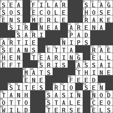 ACROSS 1. Ocean 4. Having threads 9. Volcanic refuse 13. Mayday 14. Learning spot: Fr. 15. Stockings 16. Followers of ems 17. Haggard of country music 18. Libertine 19. Title for a knight 21. Teachers' org. 22. Sports stadium 24. Indian skirt 26. Writing tablet 27. Nick name for Arthur 29. Pinches, bites 30. Actors Connery and Penn 31. Singer James 33. Actress Charlotte 36. Layer 37. Rending 40. Pipe bend 41. Newt 42. Indian titles of respect 43. Slender Brazilian palm 45. Floor coverings 47. One or ones belonging to thee 48. Compass dir. 49. Nourish 50. Settings 52. River (Sp.) 54. Elected rep. 56. Hyperbolic tangent 57. Indian antelope 59. Lower and raise head in agreement 61. Von Bismarck 62. Showing deterioration from age 63. Corporate head (abbr.) 64. Rampant 65. Laconic 66. Raised railways DOWN 1. Compass dir. 2. Immeasurably long periods of time 3. Aide 4. Opposite of masc. 5. Ancient Celtic tribe of eastern Britain 6. Old wives' tales, e.g. 7. Silent film actress Nazimova 8. To separate or throw off 9. Fragments 10. Grant temporary use of 11. "____ silly question..." 12. Turn to the right 20. Water falling in drops from the sky 22. Bee-related 23. Hit sharply and swiftly 25. State of inaction 27. American tennis player Robert 28. Coral collection 29. Nuclear Threat Initiatives 31. Hearing organs 32. Three (prefix) 33. Home 34. ____ Jay Lerner 35. Writer Wiesel 38. _____ Park, CO 39. Yard entry 44. "______ My Girl" (Turtles hit) 45. Mode 46. One (Scot) 49. Fencing necessities 50. Suttee (variant) 51. International (abbr.) 52. Pace 53. Astrian river, tributary to the Danube 55. Christmas carol 56. Pull behind 57. Fast jet (abbr.) 58. Born 60. Two (Sp.)