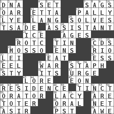 ACROSS 1. Heredity factor (abbr.) 4. Arrange properly for use 7. Droops 11. Rowing implement 12. Singer James 13. Friendly 14. Sodium hydroxide 15. Long (Scottish) 16. Finds the solution 17. Sadhe (variant) 19. Aide 21. Frozen water 23. Matures 24. College mil. group 25. Shallow baking pan 26. Music discs 29. With motion or animation 30. Followers of ems 31. River (Sp.) 32. Luau accessory 33. Consume 34. Curvy letter 35. Snakelike fish 36. Armed conflict 37. Staphylococcus 40. Filthy place 41. ___ a Wonderful Life 42. Goad 43. Old wives' tales, e.g. 45. Period of immesurable duration 46. Dwelling 51. A color or tint 55. Speaker 56. Made of lace 58. "We ___ not amused" (Victoria) 59. Carrier 60. Taken by mouth 61. Fish or hair follower 62. SW Saudi Arabia district 63. Pacific Standard Time (abbr.) 64. Deep reverence DOWN 1. Stupid person 2. Negative votes 3. Length times width 4. R.R. building 5. Inactive volcano in Sicily 6. Labels 7. Table seasonings 8. Inventor's middle name 9. Small, secluded valley 10. System (abbr.) 12. Chooses 13. Introduce or present, as a question 16. Signals 18. "Vaya con ____" 20. Inhabitant of Heaven 22. Environmental prefix 24. Agitated, as a liquid 25. Lacerates 26. Streamer paper 27. Food container 28. Mayday 29. Rendezvous 32. French article 33. Eroded 36. One who wires 37. Take to court 38. TNT 39. Hindu god of fire 43. 61 cubic inches 44. Aroma 46. Roll call or roster of names 47. Greek god of love 48. Suttee (variant) 49. Hoof sound 50. Hearing organs 52. Grandmother 53. Ship's personnel 54. False hair 57. Feline