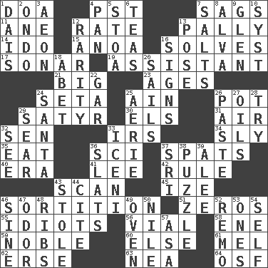 ACROSS 1. ___ good deed 4. Pacific Standard Time (abbr.) 7. Droops 11. One (Scot) 12. Pace 13. Friendly 14. Wedding promise 15. Small Philippine buffalo 16. Finds the solution 17. Echolocation 19. Helper 21. Of large size 23. Eras 24. Stalk of a moss capsule 25. The 18th letter of the Arabic alphabet 26. Cooking vessel 29. Letch 30. Raised railways 31. Wind 32. Elected rep. 33. Big collection agency 34. Playfully artful 35. Consume 36. _-fi 37. Arguments over trivial matters 40. Epoch 41. Area sheltered from the wind 42. General guideline 43. Examine hastily 45. Ending with capital 46. Conclusion 51. Nothings 55. Foolish or stupid persons 56. Small bottle 58. Compass dir. 59. Having high moral qualities 60. Otherwise 61. Cartoonist voice _ Blanc 62. Celtic language 63. Teachers' org. 64. Order of Saint Francis (abbr.) DOWN 1. Raised platform 2. Southwest Nigerian state 3. A really long time 4. Baking dish 5. Portico 6. Afternoon social gatherings 7. Table seasonings 8. Inventor's middle name 9. Small, secluded valley 10. System (abbr.) 12. Noteworthy scarcity 13. Airs 16. Signals 18. Collude with 20. Travel by water 22. Slender fish 24. Before Barbara or Clara 25. Nest on high 26. Thick mixture 27. Petroleums 28. Attempt 29. Shrivel 32. Perceive with the eye 33. Ancient Celtic tribe of eastern Britain 36. Narrow boards 37. Indian title of respect (Mr.) 38. Answer to "Whatcha doin'?" 39. Toward shelter 43. Fur scarf 44. Quote 46. Trig term 47. Aroma 48. Teases 49. Baking chamber 50. "Death on the ____" 52. San ____ (Riviera town) 53. Washington bills 54. Automatic 57. White ___ sheet