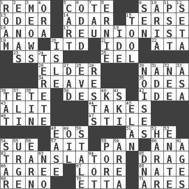 ACROSS 1. San ____ (Riviera town) 5. ____ d'Azur (French Riviera) 9. Plant excrements 13. Baltic tributary 14. The sixth month of the Jewish calendar 15. Laconic 16. Small Philippine buffalo 17. One who advocates reunion 19. Opening into something insatiable 20. It would 21. Wedding promise 22. "One Day ___ Time" 23. Fast planes 25. Snakelike fish 26. A person who is older than you are 30. Nanny 34. Rob, plunder, or pillage 35. Lyric poems 36. Wig 39. Writing tables 42. The main thing one is thinking about 43. Came down and settled, as after flight 44. Proceeds 46. Prong on a fork 47. Vertical member of a panel or frame 48. Greek goddess of the dawn 51. American tennis player Robert 54. Institute legal proceedings 57. Small island 58. Baking dish 60. Santa ___, CA 62. Interpreter 65. To draw with force 66. Match 67. Old wives' tales, e.g. 68. Nathan's nickname 69. Former U.S. Attorney General Janet 70. Singer James 71. Ancient Greek god of war DOWN 1. Wander aimlessly 2. Ferber et al. 3. Catcalls? 4. Mouth or opening 5. Heavy open wagon 6. Wrote a lyric poem 7. The 19th letter of the Greek alphabet 8. Bert's buddy 9. Elected rep. 10. Operatic vocal solo 11. Inconspicuous attention getter 12. Stalk of a moss capsule 15. Implement 18. Binary compound 20. Capri or Wright 24. Cigar-shaped 27. June honoree 28. First lady 29. Musical pauses 30. Annoying sounds 31. Say or write further 32. Born 33. White ___ sheet 36. Make lace 37. Connecticut Ivy Leaguer 38. Metal container 40. Krazy ___ of comics 41. What Jean-Claude Killy likes to do 45. Style 48. Relaxation 49. Lubricate 50. Lacking originality or spontaneity 52. Ethiopian city, capital of Harari 53. Related on the mother's side 54. Play the lead 55. Goad 56. Merit 58. Left side of a ship or aircraft 59. Type of rug 61. Ripens 63. Modern: prefix 64. Small child 65. Heredity factor (abbr.)
