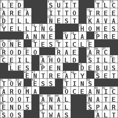 ACROSS 1. Directed 4. Costume for a special activity 8. Affectionate concern, for short 11. Length times width 13. "Tell ____ the Marines!" 14. Woody plant 15. Deli pickle 16. A home for chicks 17. Polynesian shrub of the pepper family 18. Crying or shouting loudly 21. Residences 22. Queen of England 1702-14 23. By way of 25. Before (prefix) 26. Single 29. A testis 32. Cowboy competition 34. Actress Charlotte 35. Curve 38. To provide with a ceiling 39. Hold, grip (Informal) 41. Filth; sediment 43. French article 44. Writing instrument 45. Alight from a bus 46. Plea 50. Put into a specified state 51. Pull behind 54. Double-curved letter 55. Metal containers 57. Odor 59. Pertaining to the sea 63. Plunder 64. Of or related to the anus 67. Nathan's nickname 68. Extremities 69. International (abbr.) 70. Coast Guard woman 71. Mayday 72. It was, poetically 73. The first octave above the treble staff DOWN 1. Kenny Rogers chart-topper in '80 2. 4th largest of the Great Lakes 3. Small valley 4. Burns superficially 5. Shoshoni 6. It is 7. Small child 8. _____ steamer (cargo ship) 9. Prying instrument 10. Stop 12. Silent film actress Nazimova 14. Ring climax 19. To the inside or interior of 20. Compass dir. 21. Actor Linden 23. Small bottle 24. On the rocks 26. The grampus (Milton) 27. Christmas carol 28. Singer Brickell 30. Marketplace scale 31. Relaxation 33. Otherwise 36. Chest bones 37. A slight indication 39. Tenement units (abbr.) 40. Possessive pronoun 42. Eastern Standard Time (abbr.) 45. Unit of force 47. Teachers' org. 48. Ringlike coral islands and reefs 49. Nervous spasm 51. Falsehoods 52. U. of Maine site 53. Forest 56. Without 58. Mountains (abbr.) 60. California wine valley 61. Slanted text style (abbr.) 62. Certainty 64. Small island 65. Compass dir. 66. "One Day ___ Time"