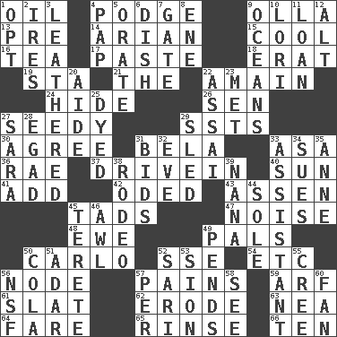 ACROSS 1. Lubricate 4. Porridge 9. Water jar 13. Before (prefix) 14. Believer in; advocate of (suffix) 15. Calm and collected 16. Afternoon social gathering 17. Thick mixture 18. Part of Q.E.F. 19. R.R. building 21. Definite Article 22. At full speed 24. Flintstone garb 26. Elected rep. 27. Sleazy 29. Fast planes 30. Match 31. Actor Lugosi 33. White ___ sheet 36. Actress Charlotte 37. Popular '50s hangout 40. Player for Phoenix 41. Say or write further 42. Wrote a lyric poem 43. NE Netherlands city 45. Small boys 47. Annoying sound 48. She-sheep 49. Friends 50. Monte _, Las Vegas Hotel/Casino 52. Compass dir. 54. And so on (abbr.) 56. Connecting point 57. Aches 59. Sandy's bark 61. Narrow board 62. Eat (away) 63. Teachers' org. 64. Conductor's collection 65. Wash lightly 66. "___ Little Indians" DOWN 1. Choose 2. Angers 3. Tough but pliablecoriaceous 4. Infant food 5. Declaim 6. Food container 7. Yard entry 8. Compass dir. 9. Seas 10. Australian parrot (variant) 11. Grant temporary use of 12. The first octave above the treble staff 20. Helper 22. Slender Brazilian palm 23. Was introduced to 25. Colored 27. "Two Mules for Sister ____" 28. Mild oath 29. Downhill vehicle 31. Auction offers 32. Night before a holiday 33. Aide 34. Institutes legal proceedings 35. Singer Murray 38. Cowboy competition 39. Grandmother 44. Not divided or shared with others 45. Cigar-shaped 46. Leather borer 49. Depends 50. Root beer relative 51. The sixth month of the Jewish calendar 52. Indian skirt 53. The Jewish people; Israel 55. Algonquian 56. Overdraft (abbr.) 57. For each 58. Observe 60. Air blower