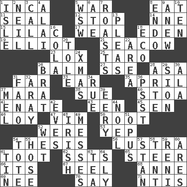 ACROSS 1. South American Indian 5. Armed conflict 8. Erode 11. Lick closed 12. Constrict 14. Compass dir. 15. Pale purple color 17. Welt 18. Locale of original sin 19. American author Paul (1891-1958) 21. Manatee 23. Brine-cured salmon 25. Pacific island yam 26. Lip ointment 27. Compass dir. 28. White ___ sheet 31. At a great distance 33. Ewer handle 35. Showery time 37. Hindu Mythology: god of death 38. Institute legal proceedings 40. Portico 41. Related on the mother's side 43. Car or cant ending 45. Elected rep. 46. Myrna of the movies 47. Zeal 50. Carrot, for example 52. Past tense of be (plural) 53. Slangy assent 54. College paper 56. A period of five years 61. A blast of a horn 62. Fast planes 65. Navigate 66. It is 67. Person who is morally reprehensible 68. Queen of England 1702-14 69. Born 70. Declare 71. Nuclear Threat Initiatives DOWN 1. Capri or Wright 2. Famous astronaut Armstrong 3. Give a ring to 4. Jai ____ 5. Compass dir. 6. Had dinner 7. Exposes to great heat 8. Inside; within (prefix) 9. Afresh 10. "___ Little Indians" 13. Entreaties 16. Root beer relative 18. Environmental prefix 20. Lacquered or enameled metalware 22. Length times width 24. Dec. holiday 26. Naughty child 28. Johnson of "Laugh-In" 29. The Jewish people; Israel 30. Chicken ___ king 31. Papal veil 32. Like ___ of sunshine 34. Regret 36. Inconspicuous attention getter 37. Cartoonist voice _ Blanc 39. Suggestive of the supernatural 42. Nights before holidays 44. Christmas carol 48. From or relating to Ireland 49. Makes clutter 51. Musical composition 52. Soggy 54. Haul 55. Flexible conduit 57. Comedian Laurel of Laurel & Hardy 58. Portable shelter 59. Painter Guido (1575-1642) 60. Ancient Greek god of war 61. Metal container 63. Afternoon social gathering 64. Secret