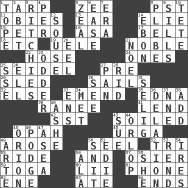 ACROSS 1. Canvas cover 5. Last letter of the English alphabet 8. Pacific Standard Time (abbr.) 11. Off-Broadway awards 13. Ewer handle 14. Writer Wiesel 15. Stone: prefix 16. White ___ sheet 17. Waist strap 18. And so on (abbr.) 19. Ubangi River tributary 21. Having high moral qualities 22. Stockings 24. Singles 25. Beer mug 27. Before (prefix) 29. Downhill vehicle 30. Travel by water 32. Otherwise 33. Make improvements or corrections to 35. Pulitzer Prize-winning author Ferber 39. The wife of a rajah (variant) 41. Grant temporary use of 42. Fast jet (abbr.) 43. Dirtied 45. Brightly colored fish 48. Capital and largest city of Mongolia 49. Came up 50. Stitch closed the eyes of (a falcon) 52. Three (prefix) 55. Travel on an animal 56. Plus 57. Flexible twig of a willow tree 59. Ancient Roman robe 60. Cards in a Roman deck? 61. Give a jingle 62. Compass dir. 63. Had dinner 64. Conclusions DOWN 1. Drink excessively 2. Collude with 3. Actors Guy, Robert Welles, and Clint 4. For each 5. Ardor 6. Relaxation 7. Epoch 8. First-year military academy student 9. Beverly of Met fame 10. False hair 12. Lush 14. Inky black, to poets 20. Snakelike fish 21. Christmas carol 23. More peculiar 25. Compass dir. 26. Pipe bend 27. Baking dish 28. To free from 30. Observe 31. Major League Baseball Commissioner Bud 33. Followers of ems 34. Was introduced to 36. Accusation by an informer 37. Compass dir. 38. Increase 40. American tennis player Robert 43. Institute legal proceedings 44. Lowest deck of a ship 45. Constellation of myth 46. Plash 47. Toward the sea 49. Johnson of "Laugh-In" 50. In a ____ (agitated or irritated) 51. Singer Brickell 53. Tear apart 54. Angers 56. According to 58. A female animal or person