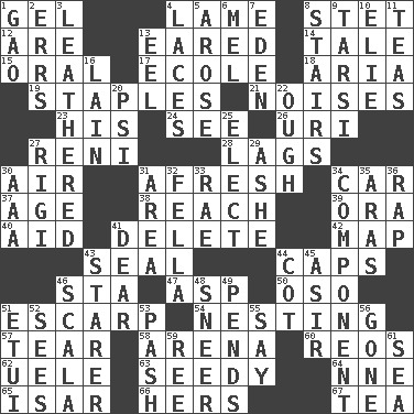 ACROSS 1. Set 4. Unable to walk 8. Proofreading order 12. "We ___ not amused" (Victoria) 13. Having ears or earlike features 14. Falsehood 15. Spoken 17. Learning spot: Fr. 18. Roberta Peters solo 19. Paper fasteners 21. Annoying sounds 23. Part of HMS, perhaps 24. Observe 26. RI univ. 27. Painter Guido (1575-1642) 28. Fails to keep up a pace 30. Wind 31. Anew 34. Auto 37. Personal question 38. Arrive at 39. Mouth or opening 40. Assist 41. Erase 42. Atlas unit 43. Lick closed 44. Balmoral and tarboosh 46. R.R. building 47. Viper 50. Bear (Spanish) 51. Fortification 54. Snuggling 57. Pull apart 58. Sports stadium 60. Vintage cars 62. Ubangi River tributary 63. Morally degraded 64. Compass dir. 65. Astrian river, tributary to the Danube 66. Possessive pronoun 67. Beverage made from leaves DOWN 1. E Mali city 2. Blunders 3. Tough but pliablecoriaceous 4. Shoestrings 5. Came up 6. Cartoonist voice _ Blanc 7. Locale of original sin 8. Flight of steps 9. Tarsus (plural) 10. Writer Wiesel 11. Afternoon social gatherings 13. Snakelike fish 16. (Had) reclined 20. 23rd letter of the Greek alphabet 22. Ending for "Through" and "Enough" 25. Voters do this 27. Swiss mountan, "Queen of the Mountains" 29. American tennis player Robert 30. American Automobile Association (abbr.) 31. Type of rug 32. Man or boy (slang) 33. Actress Charlotte 34. Part 35. Ancient river in northeast Turkey 36. Hit sharply and swiftly 41. Letter starter 43. A viewer who gazes fixedly 44. Small bed 45. SW Saudi Arabia district 46. Any of the three canals of the cochlea 48. Scornful expression 49. Hangs 51. Needle case 52. Perceives with the eye 53. Romantic infatuation 55. Declare 56. Went 59. To riddle 61. Ocean