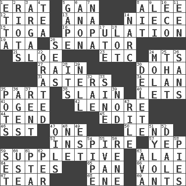 ACROSS 1. Part of Q.E.F. 5. Separate the seeds from cotton 8. Toward shelter 12. Become fatigued 13. Santa ___, CA 14. Sibling's daughter 15. Ancient Roman robe 16. Census information 19. _ moment's notice (2 wds.) 20. Elected representative 21. A type of plum 23. And so on (abbr.) 24. Mountains (abbr.) 27. Water falling in drops from the sky 30. Capital of the state of Qatar 31. Michaelmas daisies 34. Style 35. Component 38. Killed 40. Allows 41. Double curve, resembling the letter S 42. Poe poem 44. Watch over 45. Prepare for publication 46. Fast jet (abbr.) 47. Single 50. Grant temporary use of 53. Heighten or intensify 57. Slangy assent 59. Supplementary 63. Mountain range southwest of Kyrgyzstan 64. _____ Park, CO 65. Baking dish 66. Grand slam 67. Rend 68. Compass dir. 69. Pismires DOWN 1. Singer James 2. Debaucheries 3. Therefore, facetiously 4. Beverage made from leaves 5. Stare wonderingly 6. Soon (poet.) 7. California wine valley 8. Small island 9. Luau accessory 10. Environmental prefix 11. Car or cant ending 14. Drug cop 17. Shoshoni 18. Car dealer's back yard 20. Oceans 22. Spoke pompously 24. Undercover agent 25. Not this but _ 26. Without 28. ___ a Wonderful Life 29. 1994 drama film starring Jodie Foster 30. Keyboard key 32. Actress Charlotte 33. Trig term 35. Cooking vessels 36. Grows older 37. Monthly bill 39. Dreamland 43. Cause heat under the collar 47. Petroleums 48. Compass dir. 49. Eastern Standard Time (abbr.) 51. Thermoplastic polyamide 52. Started a card game 54. Corncob 55. "Terrible" tsar 56. French philosopher Descartes 58. Sliced desserts 59. Put into a specified state 60. Purpose 61. Parent Teacher Association (abbr.) 62. For each 63. Actress Gardner