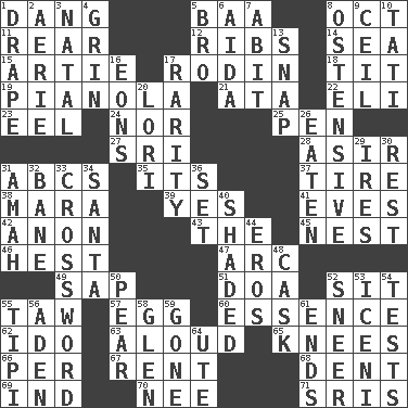 ACROSS 1. Mild oath, euphamism for damn 5. Sound made by sheep 8. Sep. follower 11. Stern 12. Teases 14. Ocean 15. Nick name for Arthur 17. "The Thinker" sculptor 18. Teat (slang) 19. Player piano 21. "One Day ___ Time" 22. Connecticut Ivy Leaguer 23. Snakelike fish 24. And not 25. Fenced enclosure 27. _ Lanka 28. SW Saudi Arabia district 31. Lettered men learn these first 35. ___ a Wonderful Life 37. Become fatigued 38. Hindu Mythology: god of death 39. Consenting reply 41. Nights before holidays 42. At once, immediately (arch.) 43. Definite Article 45. Egg locale 46. Command 47. Curve 49. Plant excrement 51. ___ good deed 52. Be seated 55. The 23rd letter of the Hebrew alphabet 57. Ovum 60. Gist 62. Wedding promise 63. Verbally 65. Leg joints 66. For each 67. Monthly bill 68. Gouge 69. Indiana (abbr.) 70. Born 71. Indian titles of respect DOWN 1. Window treatment 2. Nest on high 3. Relating to or accompanying birth 4. Amused look 5. Sis' sibling 6. Opera by Verdi 7. "This won't hurt ____!" 8. Clearly or manifestly demonstrative 9. To provide with a ceiling 10. Jacques of French films 13. Fastener 16. Immeasurably long periods of time 17. Noteworthy scarcity 20. Australian parrot (variant) 26. Ingested 29. Angers 30. Respite 31. Nursemaid 32. Object of repulsion 33. What you're doing now 34. Before Barbara or Clara 36. Put into a specified state 40. Cast a shadow over 44. Greek god of love 48. Keg 50. Lightbulb-shaped fruit 52. Scornful expression 53. Ancient Celtic tribe of eastern Britain 54. Trials 55. Native american tent (variation) 56. Arabian gulf 58. Small, secluded valley 59. Went 61. Conclusions 64. Shoshoni