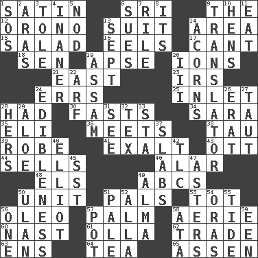 ACROSS 1. Smooth fabric 6. _ Lanka 9. Definite Article 12. U. of Maine site 13. Costume for a special activity 14. Type of rug 15. Vegetable dish 16. Snakelike fish 17. Patter 18. Elected rep. 19. Domed church section 20. Charged atoms 21. 90 degrees 23. Big collection agency 24. Blunders 25. An arm off of a larger body of water 28. Possessed 30. Goes without food and/or water 34. "Two Mules for Sister ____" 35. Connecticut Ivy Leaguer 36. Confronts 38. The 19th letter of the Greek alphabet 39. Loose flowing garment 41. Honor 43. Baseball player Mel 44. Makes a sale 46. Having or resembling wings 48. Raised railways 49. Lettered men learn these first 50. A single undivided whole 51. Friends 53. Small child 56. Butter sub 57. Inside of hand 58. Nest on high 60. Political cartoonist Thomas 61. Water jar 62. Buy and sell 63. Followers of ems 64. Beverage made from leaves 65. NE Netherlands city DOWN 1. Mayday 2. Caspian sea tributary 3. Lacquered or enameled metalware 4. More empty; more void 5. Allow head to fall sleepily 6. Takes to court 7. Cause heat under the collar 8. It is 9. Interpreter 10. Coop moms 11. Ingest 13. Back-to-school mo. 14. Oak nuts 19. Indian state 20. One more than two 22. Sandy's bark 24. The property of being fit to eat 26. Part of Q.E.F. 27. Drawn tight 28. Possessive pronoun 29. Medicinal plant 31. Observe 32. John Ritter's dad 33. R.R. building 37. Broad, flat, thick pieces 40. American author Paul (1891-1958) 42. Affectionate concern, for short 45. Fast jet (abbr.) 47. Michaelmas daisies 49. _ mater 50. Uhlan (variant) 51. Light colored 52. Silent film actress Nazimova 54. Mouths or openings 55. Event that recurs at intervals 56. Single 57. Plant holder 58. _ moment's notice (2 wds.) 59. Car or cant ending
