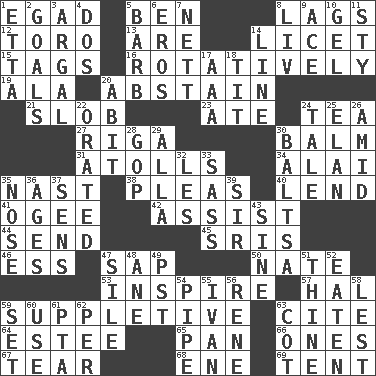 ACROSS 1. Mild oath 5. Benjamin's nick name 8. Falls behind 12. "Corrida" creature 13. "We ___ not amused" (Victoria) 14. It is permitted: Lat. 15. Labels 16. Happening in regular succession 19. According to 20. Choose not to consume 21. Oscar Madison type 23. Had dinner 24. Beverage made from leaves 27. Capital of Latvia 30. Lip ointment 31. Ringlike coral islands and reefs 34. Jai _ 35. Political cartoonist Thomas 38. Entreaties 40. Grant temporary use of 41. Double curve, resembling the letter S 42. Aid 44. Transmit 45. Indian titles of respect 46. Double-curved letter 47. Plant excrement 50. Nathan's nickname 53. Motivate 57. Actor Linden 59. Supplementary 63. Quote 64. First name in cosmetics 65. Baking dish 66. Singles 67. Pull apart 68. Compass dir. 69. Portable shelter DOWN 1. Singer James 2. Finish lines 3. Therefore, facetiously 4. Two (Sp.) 5. Sharp remark 6. Greek god of love 7. Remaining after all deductions 8. 54 in ancient Rome 9. Adept person 10. Set 11. Filthy place 14. Actor's bit 17. American Automobile Association (abbr.) 18. Teat (slang) 20. "This won't hurt ____!" 22. Declaimed 24. Falsehood 25. Liveliness 26. Among 28. Republican Party 29. Silent film actress Nazimova 30. Greek mezzo-soprano Agnes 32. French article 33. Backtalk 35. Sense of smell 36. Eons 37. Elected reps. 39. Title for a knight 43. Trig term 47. Drop; flow; fall 48. A saturated hydrocarbon 49. Pacific Standard Time (abbr.) 51. One or ones belonging to thee 52. Eroded 54. Corncob 55. _ the terrible 56. French philosopher Descartes 58. For fear that 59. Put into a specified state 60. Purpose 61. Parent Teacher Association (abbr.) 62. For each 63. Small bed