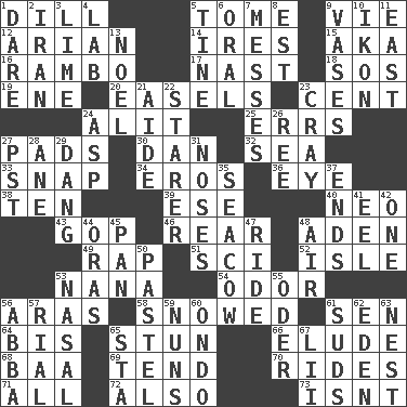 ACROSS 1. Deli pickle 5. Heavy book 9. Compete 12. Believer in; advocate of (suffix) 14. Angers 15. Alias (abbr.) 16. Role for Stallone 17. Political cartoonist Thomas 18. Mayday 19. Compass dir. 20. Artist's stands 23. Penny 24. Set down 25. Blunders 27. Writing tablets 30. Daniel's nick name 32. Ocean 33. Fastener 34. Greek god of love 36. Sight organ 38. "___ Little Indians" 39. Compass dir. 40. Modern: prefix 43. Republican Party 46. Posterior 48. An important port of Yemen 49. Reproach for some lapse or misdeed 51. _-fi 52. Small island 53. Grandmother 54. Aroma 56. Ancient river in northeast Turkey 58. Frozen precipiation fell 61. Elected rep. 64. Altar cloth linen 65. Surprise greatly 66. Evade 68. Sound made by sheep 69. Watch over 70. Amusement-park features 71. 100% 72. In addition 73. Is not DOWN 1. Have the gumption 2. SW Asia republic 3. Welles in "The Third Man" 4. Experiment locale 5. Prong on a fork 6. Spoken 7. Makes clutter 8. Eastern Standard Time (abbr.) 9. Flower holders 10. Image 11. 90 degrees 13. Christmas carol 21. Assistant 22. A viewer who gazes fixedly 23. Supercomputer manufacturer 24. Cleo's killer 26. To riddle 27. Pacific Standard Time (abbr.) 28. One (Scot) 29. Mild oath, euphamism for damn 31. Olfactory organs 35. Manatee 37. Extremities 41. Snakelike fish 42. Single 44. Mouths or openings 45. Baking dish 47. Travel on or in a vehicle 48. Atmosphere 50. Soft color 53. Rhinal 55. Baltic tributary 56. Swedish rock group 57. Monetary unit of Yemen 59. Religious women 60. Southwest Nigerian state 61. Beer foam 62. Locale of original sin 63. Egg locale 65. R.R. building 67. Cards in a Roman deck?
