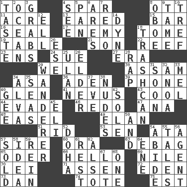 ACROSS 1. Coat; cloak 4. Coast Guard woman 8. Baseball player Mel 11. Land measure 13. Having ears or earlike features 15. Drinking establishment 16. Lick closed 17. Foe 18. Heavy book 19. Eating place 21. Male offspring 22. Coral collection 23. Followers of ems 24. Institute legal proceedings 27. Period 29. Water source 30. Indian state 34. White ___ sheet 36. Arabian gulf 39. Give a jingle 40. Small, secluded valley 41. Mole, birthmark 43. Calm and collected 44. Dodge 46. Redecorate 47. Santa ___, CA 48. Artist's stand 49. Enthusiasm 51. To free from 53. Elected rep. 54. _ moment's notice (2 wds.) 57. Father 60. Mouth or opening 63. Debunk (Brit. slang) 65. Baltic tributary 66. Phone greeting 69. "Death on the ____" 70. Flowery wreath 71. NE Netherlands city 72. Locale of original sin 73. Daniel's nick name 74. Haul 75. Eastern Standard Time (abbr.) DOWN 1. Clothes sense 2. Sea 3. Catches 4. Perceive with the eye 5. Baking dish 6. Ancient Greek god of war 7. San ____ (Riviera town) 8. Mitch Miller's instrument 9. Docile 10. Unclean, religiously 12. Pipe bend 14. Unit of force 18. File 13 20. Compass dir. 25. ____ Bator, Mongolia 26. A person who is older than you are 28. Strike 29. Roamer 31. Within a short period 32. Small Philippine buffalo 33. Cartoonist voice _ Blanc 34. Inventor's middle name 35. Oceans 37. Night before a holiday 38. Unclothed pictures 40. Unit of force equal to gravity 42. Flatfish 45. Connecticut Ivy Leaguer 50. Also 52. Capital of the state of Qatar 54. Stay 55. Stories 56. Representative 57. Disposed of to a purchaser 58. The content of cognition 59. It's straight from the horse's mouth 61. State of inaction 62. In addition 64. Compass dir. 67. Allow 68. Single