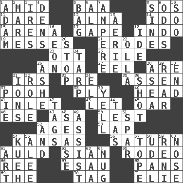 ACROSS 1. Among 5. Sound made by sheep 8. Distress signal 11. Have the gumption 12. _ mater 14. Wedding promise 15. Sports stadium 17. Open wide 18. _ china 19. Makes clutter 21. Eats (away) 23. Baseball player Mel 25. Cause heat under the collar 26. Small Philippine buffalo 27. Snakelike fish 28. "We ___ not amused" (Victoria) 31. Big collection agency 33. Before (prefix) 35. NE Netherlands city 37. "Silly old bear" 38. Travel a route regularly 40. Froth on beer 41. An arm off of a larger body of water 43. Allow 45. Rowing implement 46. Compass dir. 47. White ___ sheet 50. For fear that 52. Grows older 53. Pet locale 54. Sunflower state 56. Titan orbits this 61. Old (Scot.) 62. Thailand, formerly 65. Cowboy competition 66. To separate or throw off 67. He sold his birthright 68. Zero-star reviews 69. Definite Article 70. Label 71. Writer Wiesel DOWN 1. First man 2. Female horse 3. Angers 4. Lairs 5. Paper or plastic container 6. In the manner of 7. Electrical Unit 8. Trig term 9. Likelihood 10. "Barney Miller" actor Jack 13. Nest on high 16. Age 18. Binary compound 20. Discontinue 22. Spanish pot 24. Canvas cover 26. American tennis player Robert 28. At sea 29. Buttocks 30. Conclusion 31. Charged atoms 32. Hero or heavy, e.g. 34. Pipe bend 36. Opportunity 37. Sliced dessert 39. Shout 42. Labels 44. Beverages made from leaves 48. Gospel singer Marvin 49. Help 51. Coast Guard woman 52. Also 54. Malaysian steamed pastry 55. Toward shelter 57. Drink excessively 58. Allodial 59. Painter Guido (1575-1642) 60. Olfactory organ 61. Tate display 63. Auto club (abbr.) 64. Java container