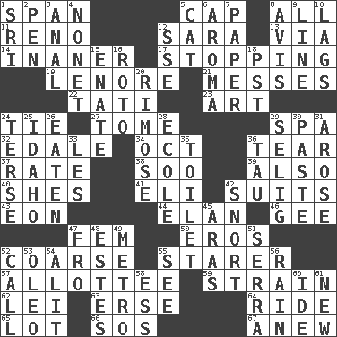 ACROSS 1. Connect, as a bridge 5. Head covering 8. Everything 11. Western Nevada city 12. "Two Mules for Sister ____" 13. By way of 14. More lacking in sense or substance 17. Obstructing or blocking passage 19. Poe poem 21. Makes clutter 22. Jacques of French films 23. Nonscientific branch of learning 24. Neckwear 27. Heavy book 29. Health resort 32. Peak District village in England 34. Sep. follower 36. Separate forcefully 37. Assign a rank or rating to 38. "Barney Miller" actor Jack 39. In addition 40. "______ My Girl" (Turtles hit) 41. Biblical high priest 42. Costumes for special activities 43. Period of immesurable duration 44. Liveliness 46. Turn to the right 47. Opposite of masc. 50. Greek god of love 52. Unrefined 55. A viewer who gazes fixedly 57. One to whom something is allotted 59. Put through a sieve 62. Luau accessory 63. Celtic language 64. Travel on or in a vehicle 65. Car dealer's back yard 66. Distress signal 67. Afresh DOWN 1. _ Lanka 2. Writing instrument 3. Of or related to the anus 4. Music written for nine 5. Feline 6. Scent 7. Some stationery 8. Deliberation 9. Actor's bit 10. Falls behind 12. Compass dir. 15. Maternal 16. Printing process, for short 18. Pacific Standard Time (abbr.) 20. Full of chinks, cracks, or crevices 24. Laconic 25. Potato state 26. Consumed 28. Learning spot: Fr. 29. Major League Baseball Commissioner Bud 30. Thick mixture 31. Came up 33. French article 35. Bathroom 36. The 19th letter of the Greek alphabet 42. Derisive sound 45. Caspian sea tributary 47. From 48. _____ Park, CO 49. Paris' subway 51. Father Junipero _ 52. Give a ring to 53. Margarine 54. Set down 55. Observe 56. Water falling in drops from the sky 58. Curvy letter 60. Binary compound 61. ___ Haven, CT
