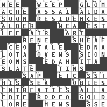 ACROSS 1. Born 4. Shed a tear 8. Take by theft 12. 43,560 square feet 14. Slender Brazilian palm 16. Opera by Verdi 17. Within a short period 18. Homes 20. Tree or shrub in the Birch family 22. Teachers' org. 23. Eastern Standard Time (abbr.) 24. Area sheltered from the wind 25. Atmosphere 28. Tate display 30. French philosopher Descartes 31. To gather and bind into a bundle 35. Corporate head (abbr.) 37. Story 40. Pulitzer Prize-winning author Ferber 41. Globular water bottle used in Asia 42. Baking chambers 44. The Jewish people; Israel 45. Immeasurably long periods of time 46. Dutch treat 47. Call ___ day 48. Chalkboard 50. Airtight sealed metal containers 52. Plant excrement 54. And so on (abbr.) 55. Fast jet (abbr.) 58. Part of HMS, perhaps 61. Ocean 63. Off-Broadway awards 65. Pleas 70. Silent film actress Nazimova 71. Singer Brickell 72. Cowboy competition 73. Precious metal 74. Old wives' tales, e.g. 75. Not women's 76. Compass dir. DOWN 1. Relating to the nose 2. Learning spot: Fr. 3. Wear away 4. Armed conflict 5. Compass dir. 6. Double-curved letter 7. Ache 8. Separate the seeds from cotton 9. Louse (plural) 10. Lyric poems 11. Vertical spar for supporting sails 13. Compass dir. 15. The main thing one is thinking about 19. Hearing organs 21. Actress Charlotte 26. To the inside or interior of 27. Break or tear apart 29. College paper 30. Ridicules or criticizes harshly 32. Prepare for publication 33. Small Philippine buffalo 34. Air blower 35. Calm and collected 36. Inactive volcano in Sicily 38. Directed 39. Maternal 41. French article 43. Stricken, poetically 49. Relaxation 51. Non-commissioned officer (abbr.) 53. Lightbulb-shaped fruit 55. Grain storage towers 56. Exchanges for money 57. Sadhe (variant) 58. Person who is morally reprehensible 59. _ china 60. Move through with a circular motion 62. Tiny particle 64. Container for groceries 66. Portuguese money of account (variant) 67. Binary compound 68. Car or cant ending 69. Distress signal