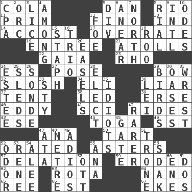 ACROSS 1. Root beer relative 5. One of the 12 tribes of Israel 8. River (Sp.) 11. Demure 12. A pale, very dry sherry 13. Working for oneself (abbr.) 14. Buttonhole 17. Make much ado about nothing 19. Main course 21. Ringlike coral islands and reefs 22. Greek goddess of the earth (variant) 23. 17th letter of the Greek alphabet 24. Double-curved letter 27. Airs 29. Ribbon knot 32. Splash clumsily 34. Biblical high priest 36. One who doesn't tell the truth 37. Portable shelter 38. Directed 39. Celtic language 40. Whirlpool 41. _-fi 42. Amusement-park features 43. Compass dir. 44. Ancient Roman robe 46. Fast jet (abbr.) 47. Nanny (var.) 50. Small pie 52. Spoke pompously 55. Michaelmas daisies 57. Accusation by an informer 59. Worn away 62. Single 63. Roll call or roster of names 64. Billionth: prefix 65. To riddle 66. Eastern Standard Time (abbr.) 67. Makes supply last DOWN 1. Accounting whiz (abbr.) 2. The grampus (Milton) 3. Louse (plural) 4. Amid 5. HTML Container Element 6. Approach 7. 0 degrees 8. Monetary unit of Yemen 9. International (abbr.) 10. Lyric poems 12. Enemy 15. Staphylococcus 16. Musical group of three 18. Friend of Pooh 20. Artist's stands 24. First name in cosmetics 25. Bobsleighs 26. Message 28. Voters do this 29. Avian creatures 30. Fertile tracts in a desert 31. Take or capture by force 33. Filthy place 35. Foolish or stupid persons 36. Luau accessory 42. More uncommon 45. Yard entry 47. _ moment's notice (2 wds.) 48. Distance measurement (Brit.) 49. Goodbye (Sp.) 51. Marketplace scale 52. Aroma 53. French philosopher Descartes 54. Toward shelter 55. Santa ___, CA 56. Neighbor of Neb. 58. Baseball player Mel 60. Compass dir. 61. Two (Sp.)
