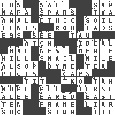 ACROSS 1. Begley and Asner 4. Table seasoning 8. Plant excrement 11. California wine valley 13. Practice fights 15. Federal power corp. 16. Of or related to the anus 17. Value system 18. Land 19. Portable shelters 21. Friend of Pooh 22. Small boys 23. Curvy letter 24. Observe 27. The 19th letter of the Greek alphabet 29. Smallest unit of an element 30. Perfect 34. Actor Linden 36. Egg locale 39. Haggard of country music 40. Place where flour is made 41. Slow-paced one 43. The longest river in the world 44. Columnist Joseph or Stewart 46. Unit of force 47. Beverage made from leaves 48. Ground plans 49. Smile enhancers 51. Teat (slang) 53. Ring climax 54. Scottish cap 57. Greater amount 60. To riddle 63. Laconic 65. Toward shelter 66. Having ears or earlike features 69. 90 degrees 70. Nine, plus one 71. Movie unit 72. One who doesn't tell the truth 73. "Barney Miller" actor Jack 74. Make senseless or dizzy 75. Neckwear DOWN 1. Maternal 2. Natives or inhabitants of Denmark 3. Connects, as a bridge 4. Compass dir. 5. Fitting 6. Cowardly lion portrayer 7. Musical group of three 8. Portico 9. Enthusiastic 10. Friends 12. The first octave above the treble staff 14. Native of Scotland 18. SAT takers 20. Fast jet (abbr.) 25. Immeasurably long periods of time 26. Make improvements or corrections to 28. Direct toward a target or goal 29. One to whom something is allotted 31. One of the Great Lakes 32. Silent film actress Nazimova 33. Area sheltered from the wind 34. Land elevation 35. In addition 37. Declare 38. A color or tint 40. Atlas unit 42. Path through which fluid escapes 45. 23rd letter of the Greek alphabet 50. Plant holder 52. Not kosher 54. Distinguishing feature 55. Slender Brazilian palm 56. Distance measurement (Brit.) 57. Floor coverings 58. Margarine 59. Former U.S. Attorney General Janet 61. Hearing organs 62. Part of Q.E.F. 64. Snakelike fish 67. Australian flightless bird 68. Lair