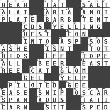 ACROSS 1. Bring up, as a child 5. Make lace 8. Table seasoning 12. Jai ____ 13. Roberta Peters solo 15. Mine, in Marseilles 16. Food holder 18. Sharp remark 19. Portable shelter 20. Music discs 22. Crying or shouting loudly 24. Behest 26. Period of immesurable duration 27. To the inside or interior of 28. Viper 29. Distress signal 32. American tennis player Robert 35. Is not 37. Small child 38. "Vaya con ____" 39. Area sheltered from the wind 40. Drink excessively 41. 100% 42. Fermented drink made from hops 43. Compass direction 44. To sift 45. Domesticated feline 46. Take by theft 49. Set 50. Sharp bark 51. Manned the helm 55. Turn to the right 56. Comfort 57. Clip 59. Motion picture award 63. Connect, as a bridge 64. Sums up 65. Jacques of French films 66. Merit 67. Be seated 68. Broke a traffic law DOWN 1. Hit sharply and swiftly 2. Pipe bend 3. Auto club (abbr.) 4. Actors Guy, Robert Welles, and Clint 5. Bar bill 6. Like ___ of sunshine 7. Become fatigued 8. Smooth fabric 9. So be it 10. Having great length 11. Teat (slang) 14. Most capable 17. Genesis locale 21. Fast jet (abbr.) 23. Chop off 25. Bathroom plumbing fixture 28. Disorder of the immune system 29. Portico 30. I made a mistake 31. Proofreading order 32. The sixth month of the Jewish calendar 33. Filth; sediment 34. Hollow 36. Observe 40. Storms 42. Greek mezzo-soprano Agnes 45. Corporate head (abbr.) 47. Part of a journey 48. Butter sub 49. American astronaut and politician John 51. Dad 52. Astrian river, tributary to the Danube 53. Conclusions 54. "You Light Up My Life" star Conn 56. Compass dir. 58. Pacific Standard Time (abbr.) 60. Head covering 61. Had dinner 62. To free from