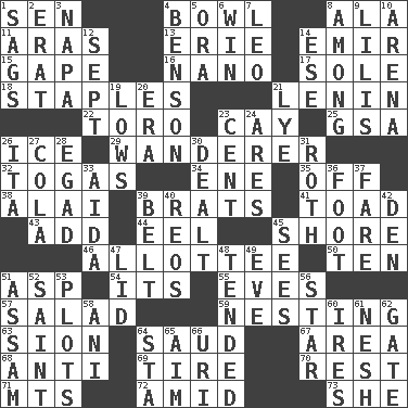 ACROSS 1. Elected rep. 4. Soup holder 8. Wing 11. Caspian sea tributary 13. 4th largest of the Great Lakes 14. Independent ruler or chieftain 15. Stare wonderingly 16. Billionth: prefix 17. Not divided or shared with others 18. Paper fasteners 21. Soviet premier 1918-24 22. "Corrida" creature 23. Island 25. Girls' org. (abbr.) 26. Frozen water 29. Roamer 32. Ancient Roman robes 34. Compass dir. 35. Below a satisfactory level 38. Jai _ 39. Naughty children 41. Frog relative 43. Find the sum of 44. Snakelike fish 45. Dinah or Pauly 46. One to whom something is allotted 50. Nine, plus one 51. Cleo's killer 54. It is 55. Nights before holidays 57. Vegetable dish 59. Snuggling 63. The Jewish people; Israel 64. Saudi Arabian king (1953-1964) 67. Length times width 68. Against 69. Hoop that covers a wheel 70. Remainder 71. Mountains (abbr.) 72. Among 73. A female animal or person DOWN 1. Sinks 2. Part of Q.E.F. 3. California wine valley 4. Gillaume's butler role 5. Mouth or opening 6. Victory 7. Lion 8. Amid 9. Ms. Damita and namesakes 10. Sports stadium 12. Back-to-school mo. 14. Compass dir. 19. Moos 20. Period 21. Sodium hydroxide 23. Penny 24. Ancient Greek god of war 26. Call ___ day 27. Root beer relative 28. Mild oath 30. Started a card game 31. Writer of Portnoy's Complaint (1969) 33. Opera by Verdi 36. Pick up the tab 37. Conductor's collection 39. Waist strap 40. Vintage cars 42. Lair 45. Observes 47. Hat (slang) 48. Watched over 49. Night before a holiday 51. Indian state 52. Inhabitant of Heaven 53. Secret plans 56. Play the lead 58. Cuckoo 60. Angers 61. Delicate 62. Yard entry 64. R.R. building 65. Direct toward a target or goal 66. RI univ.
