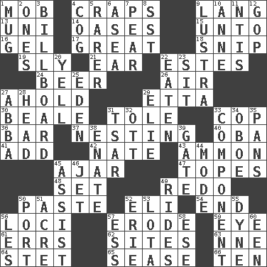 ACROSS 1. Crowd into 4. Dice game 9. Long (Scottish) 13. Single; one (prefix) 14. Fertile tracts in a desert 15. To (old English) 16. Set 17. Relatively large 18. Clip 19. Playfully artful 21. Hearing organ 22. _____ Park, CO 24. Fermented drink made from hops 26. Wind 27. Hold, grip (Informal) 29. Singer James 30. Calif. Air Force Base 31. Lacquered or enameled metalware 33. Police officer (slang) 36. Oblong piece of solid material 37. Snuggling 40. Chief or king in Benin or Nigeria 41. Increase 42. Nathan's nickname 43. ID or VA city 45. Partly open 47. Drinks excessively 48. Put into a specified state 49. Redecorate 50. Thick mixture 52. Connecticut Ivy Leaguer 54. Conclude 56. Locales 57. Wear away 59. Sight organ 61. Blunders 62. Settings 63. Compass dir. 64. Proofreading order 65. Gospel singer Marvin 66. "___ Little Indians" DOWN 1. Java container 2. Washington bills 3. Big road sign 4. Gear tooth 5. More uncommon 6. Toward the sea 7. Lightbulb-shaped fruit 8. Fast jet (abbr.) 9. A period of five years 10. Singer Murray 11. Nuclear Threat Initiatives 12. Grand Old Party 20. Shout 22. Ingested 23. Be seated 25. Paradise 27. Swedish rock group 28. Froth on beer 29. Writer Wiesel 31. Russian ruler of old 32. Baseball player Mel 33. Piece 34. Mitch Miller's instrument 35. Zero-star reviews 38. Related on the mother's side 39. Yard entry 44. Method 45. Aid 46. Passenger plane 49. Amusement-park features 50. Left side of a ship or aircraft 51. 1/640 square mile 52. One of the Great Lakes 53. Globular water bottle used in Asia 55. Centimeter-gram-second unit of force 56. French article 57. Curvy letter 58. Compass dir. 60. Car or cant ending
