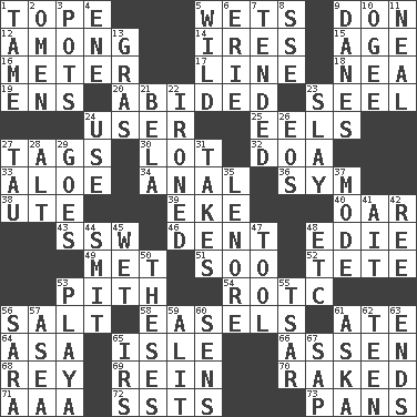 ACROSS 1. Drink excessively 5. Soaks 9. Spanish title 12. Amid 14. Angers 15. Mature 16. Distance measurement 17. Actor's bit 18. Teachers' org. 19. Followers of ems 20. Tolerated 23. Stitch closed the eyes of (a falcon) 24. One who uses or employs something 25. Snakelike fish 27. Labels 30. Car dealer's back yard 32. ___ good deed 33. Medicinal plant 34. Of or related to the anus 36. Symbol (abbr.) 38. Shoshoni 39. Supplement with great effort 40. Rowing implement 43. Compass dir. 46. Gouge 48. Singer Brickell 49. Was introduced to 51. "Barney Miller" actor Jack 52. False hair 53. Essential or central part 54. College mil. group 56. Table seasoning 58. Artist's stands 61. Had dinner 64. White ___ sheet 65. Capri or Wright 66. NE Netherlands city 68. Marina Del _, California 69. It's straight from the horse's mouth 70. Swept the length of 71. American Automobile Association (abbr.) 72. Fast planes 73. Baking dishes DOWN 1. Docile 2. Presage 3. Cooking vessels 4. Compass dir. 5. Rampant 6. One of the Great Lakes 7. Watched over 8. Compass dir. 9. Natives or inhabitants of Denmark 10. Double curve, resembling the letter S 11. Anneal 13. Pate de foie ____ 21. Actor Lugosi 22. Pressed 23. Kill 24. Purpose 26. Greek goddess of the dawn 27. The 19th letter of the Greek alphabet 28. The first octave above the treble staff 29. Travels 31. Receives possession of 35. Poe poem 37. Method 41. Small island 42. To riddle 44. Stricken, poetically 45. Soggy 47. Utensil 48. And so on (abbr.) 50. College papers 53. Beach, in Buenos Aires 55. Russian ruler of old 56. "Two Mules for Sister ____" 57. At sea 59. Set down 60. Elected reps. 61. "____ silly question..." 62. Adolescent 63. Extremities 65. Big collection agency 67. Plant excrement