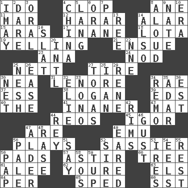 ACROSS 1. Wedding promise 4. Hoof sound 8. A saturated hydrocarbon 11. Third mo. 12. Ethiopian city, capital of Harari 14. Having or resembling wings 15. Ancient river in northeast Turkey 17. Silly 18. Globular water bottle used in Asia 19. Crying or shouting loudly 21. Follow as a consequence or result 23. Santa ___, CA 24. Dreamland 25. Remaining after all deductions 27. Hoop that covers a wheel 30. Teachers' org. 31. Poe poem 34. Actress Charlotte 37. Curvy letter 38. Utah city north of Ogden 39. Begley and Asner 40. Definite Article 41. More empty; more void 43. Floor protector 44. Vintage cars 45. Russian composer Stravinsky 47. "We ___ not amused" (Victoria) 49. Australian flightless bird 50. Frolics 52. More impudent 56. Groovy apts. 57. Moving or stirring 60. Woody plant 61. Toward shelter 62. You are 63. Raised railways 64. For each 65. Moved rapidly 66. Fast jet (abbr.) DOWN 1. "If ____ say so..." 2. Have the gumption 3. Relating to the mouth 4. Large country 5. Long (Scottish) 6. Mouth or opening 7. Baking dish 8. Verbally 9. Nathan's nickname 10. Period 13. To riddle 14. In addition 16. Narrow board 20. International (abbr.) 22. Compass dir. 25. Delicate 26. Comfort 27. Ancient Roman robes 28. SW Asia republic 29. French philosopher Descartes 30. Fish or hair follower 32. Writer Wiesel 33. Words to Nanette 34. San ____ (Riviera town) 35. The sixth month of the Jewish calendar 36. Eastern Standard Time (abbr.) 42. Basketball hoops 44. Marina Del _, California 46. Abrupt rush of wind 47. Tree or shrub in the Birch family 48. Raze (variant) 49. Having ears or earlike features 50. Diluted with white 51. Declare 52. The founder of a family 53. Angers 54. Snakelike fish 55. Take ten 56. Infant food 58. Mayday 59. Uncastrated adult male sheep