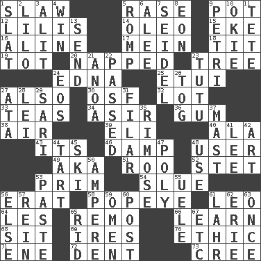 ACROSS 1. Cole _ (cabbage dish) 5. Raze (variant) 9. Cooking vessel 12. Ms. Damita and namesakes 14. Margarine 15. Supplement with great effort 16. Place in a line 17. Chow _ 18. Teat (slang) 19. Small child 20. Slept 23. Woody plant 24. Pulitzer Prize-winning author Ferber 25. Needle holder 27. In addition 30. Order of Saint Francis (abbr.) 32. Car dealer's back yard 33. Afternoon social gatherings 34. SW Saudi Arabia district 36. Chewing product 38. Wind 39. Connecticut Ivy Leaguer 40. Chicken ___ king 43. ___ a Wonderful Life 46. Moist 48. One who uses or employs something 49. Alias (abbr.) 51. Friend of Pooh 52. Proofreading order 53. Demure 54. Change direction abruptly 56. Part of Q.E.F. 58. Wimpy's pal 61. Lion 64. French article 65. San ____ (Riviera town) 66. Memorize 68. Be seated 69. Angers 70. Principle of right and wrong 71. Compass dir. 72. Gouge 73. Algonquian DOWN 1. Narrow board 2. _ and Stitch 3. Set down 4. Victory 5. Frolic 6. Toward shelter 7. Beer mug 8. A really long time 9. _ dish (used to culture cells) 10. Migrant worker of the '30s 11. Wig 13. Transmit 21. Small Philippine buffalo 22. Went by 23. Ballerina skirt 24. Greek goddess of the dawn 26. Coat; cloak 27. _ moment's notice (2 wds.) 28. Luau accessory 29. Indian skirt 31. Of or pertaining to a thread or threads 35. Full of chinks, cracks, or crevices 37. Vertical spar for supporting sails 41. Area sheltered from the wind 42. Tate display 44. Small pie 45. What Jean-Claude Killy likes to do 47. Many (prefix) 48. Purpose 50. Electrical Unit 53. Thick mixture 55. Ubangi River tributary 56. Otherwise 57. It's straight from the horse's mouth 59. Presage 60. Mail 61. Cowardly lion portrayer 62. 4th largest of the Great Lakes 63. Single time 65. To free from 67. And so on (abbr.)