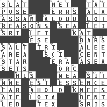 ACROSS 1. Narrow board 5. Was introduced to 8. Make lace 11. Airs 12. Blunders 14. Wing 15. Indian state 17. Verbally 18. Car dealer's back yard 19. Thinks logically 21. Ocean 22. Flowery wreath 23. _ Lanka 24. Allow 25. Krazy ___ of comics 27. Compass dir. 28. Taverns 31. Table seasoning 35. Three (prefix) 37. Toward shelter 38. Type of rug 39. _-fi 41. Penny 42. Play the lead 43. Period 45. Toward the sea 46. Puts into a specified state 47. The grampus (Milton) 49. Part of HMS, perhaps 51. Teachers' org. 52. Be seated 55. Compass dir. 57. Eastern Standard Time (abbr.) 60. Center 62. Ewer handle 63. Hold, grip (Informal) 65. Leg joints 66. Had dinner 67. Globular water bottle used in Asia 68. Scratch 69. Directed 70. John Ritter's dad 71. Indian titles of respect DOWN 1. Practice fights 2. Failure 3. Slender Brazilian palm 4. Beverages made from leaves 5. Cartoonist voice _ Blanc 6. Greek god of love 7. Loyal 8. Baron Munchausen's specialties 9. Medicinal plant 10. Jacques of French films 13. Neighbor of Neb. 16. Undercover agent 17. Michaelmas daisies 20. A home for chicks 26. Phillipine bananalike plant 29. French philosopher Descartes 30. Stalk of a moss capsule 31. Backtalk 32. Johnson of "Laugh-In" 33. Resembling or made to resemble leather 34. Tarsus (plural) 36. Frozen water 40. Pressed 44. Ancient Greek god of war 48. Keg 50. Lick closed 52. Scornful expression 53. Ancient Celtic tribe of eastern Britain 54. Trials 55. Actress Patricia 56. Nathan's nickname 58. Opportunity 59. Carryall 61. Conclusions 64. Not strict