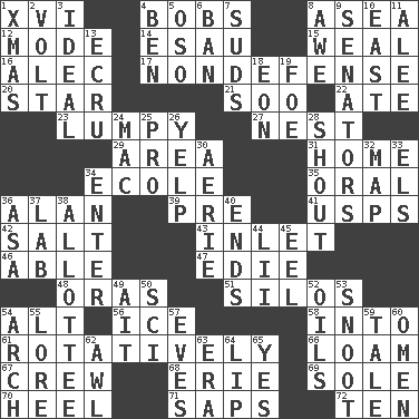 ACROSS 1. 16 4. Moves up and down 8. At sea 12. Method 14. He sold his birthright 15. Welt 16. Actor Baldwin 17. Unrelated to defense, as in spending 20. Play the lead 21. "Barney Miller" actor Jack 22. Had dinner 23. Containing lumps 27. Egg locale 29. Length times width 31. Dwelling 34. Learning spot: Fr. 35. Relating to the mouth 36. Actor Alda or Thicke 39. Before (prefix) 41. United States Postal Service (abbr.) 42. Table seasoning 43. An arm off of a larger body of water 46. Competent 47. Singer Brickell 48. Mouths or openings 51. Grain storage towers 54. Keyboard modifier key 56. Frozen water 58. To the inside or interior of 61. Rotating or pertaining to rotation 66. Rich soil 67. Group working together 68. One of the Great Lakes 69. Flatfish 70. Person who is morally reprehensible 71. Plant excrements 72. Nine, plus one DOWN 1. Dec. holiday 2. Electrical Unit 3. Perfect 4. Benjamin's nick name 5. Bear (Spanish) 6. Bar 7. Soap bubbles 8. Deep reverence 9. Elected representatives 10. 90 degrees 11. Toward shelter 13. Shade of tan 18. Age 19. Enemy 24. Apple computer (short form) 25. Adept person 26. Sharp bark 28. Yell 30. Nest on high 32. Atlas unit 33. Raised railways 34. Keyboard key 36. White ___ sheet 37. Experiment locale 38. One to whom something is allotted 40. Conclusions 44. Cards in a Roman deck? 45. Snakelike fish 49. Small island 50. _-fi 52. Petroleums 53. Snout, nose 54. Bowlike part 55. Old wives' tales, e.g. 57. Nights before holidays 59. Falsehood 60. Sign of something about to happen 62. Leather borer 63. Period 64. Mouth edge 65. Consenting reply