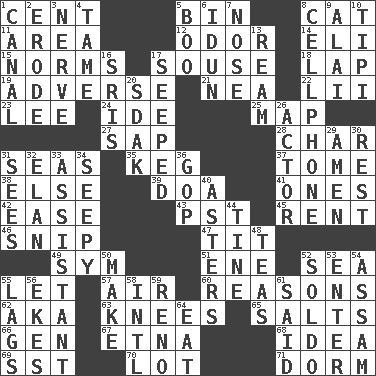 ACROSS 1. Penny 5. Storage container 8. Domesticated feline 11. Length times width 12. Scent 14. Connecticut Ivy Leaguer 15. Typical standards 17. Boozer 18. Pet locale 19. Contrary to your interests or welfare 21. Teachers' org. 22. Cards in a Roman deck? 23. Area sheltered from the wind 24. Binary compound 25. Atlas unit 27. Plant excrement 28. Burn to charcoal 31. Oceans 35. Barrel 37. Heavy book 38. Otherwise 39. ___ good deed 41. Washington bills 42. Relaxation 43. Pacific Standard Time (abbr.) 45. Monthly bill 46. Clip 47. Teat (slang) 49. Symbol (abbr.) 51. Compass dir. 52. Ocean 55. Allow 57. Wind 60. Thinks logically 62. Alias (abbr.) 63. Leg joints 65. Table seasonings 66. Commissioned military rank (abbr.) 67. Inactive volcano in Sicily 68. The content of cognition 69. Fast jet (abbr.) 70. Car dealer's back yard 71. Dormintory (informal) DOWN 1. Lessep's creation 2. Eat (away) 3. Impudent aggressiveness 4. Not wild 5. Sometimes accompanies a hiss 6. Goddess of spring and wife of Bragi 7. Olfactory organ 8. Portable communications device 9. Jai _ 10. Native american tent (variation) 13. 480, 500 or 516 sheets of paper 16. Indian titles of respect 17. Oozed 20. Neighbor of Neb. 26. Thespian 29. So be it 30. State of inaction 31. Perceives with the eye 32. Style 33. Aide 34. Oozy 36. Republican Party 40. Michaelmas daisies 44. Prong on a fork 48. Beverages made from leaves 50. Create 52. Twentieth part of a lira 53. Keyboard key 54. Indian state 55. Falls behind 56. Supplements with great effort 58. International (abbr.) 59. Former U.S. Attorney General Janet 61. Expressed in words 64. Ingest