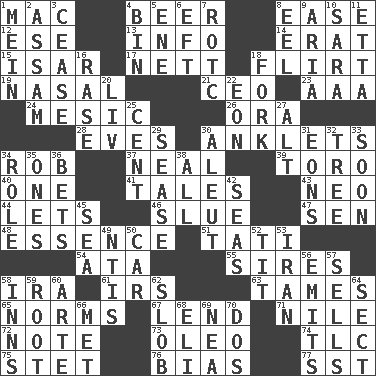 ACROSS 1. Apple computer (short form) 4. Fermented drink made from hops 8. Comfort 12. Compass dir. 13. A message received and understood 14. Part of Q.E.F. 15. Astrian river, tributary to the Danube 17. Remaining after all deductions 18. Seductive woman who exploits men 19. Relating to the nose 21. Corporate head (abbr.) 23. American Automobile Association (abbr.) 24. Mesonic 26. Mouth or opening 28. Nights before holidays 30. Short socks 34. Director Reiner 37. Actress Patricia 39. "Corrida" creature 40. Single 41. Lies 43. Modern: prefix 44. Allows 46. Turn sharply 47. Elected rep. 48. Center 51. Jacques of French films 54. "One Day ___ Time" 55. Male parents of animals 58. Retirement account (abbr.) 61. Big collection agency 63. Corrects by punishment or discipline 65. Typical standards 67. Grant temporary use of 71. "Death on the ____" 72. Musical sound 73. Butter sub 74. Affectionate concern, for short 75. Proofreading order 76. Prejudice 77. Fast jet (abbr.) DOWN 1. Chow _ 2. Indian state 3. Stop 4. Storage container 5. Compass dir. 6. Bank Draft (abbr.) 7. College mil. group 8. Snakelike fish 9. Operatic vocal solo 10. "Two Mules for Sister ____" 11. Singer James 16. To erase 18. Tined utensil 20. 54 in ancient Rome 22. Age 25. Penny 27. The first octave above the treble staff 29. Gospel singer Marvin 30. Native American of Southwest Alaska 31. Immeasurably long periods of time 32. Woody plant 33. Within a short period 34. Hero or heavy, e.g. 35. Washington bills 36. Stakes 38. Everything 42. Oceans 45. Ocean 49. Nuclear Threat Initiatives 50. Automobile 52. Teat (slang) 53. SW Asia republic 56. Sends forth 57. Makes a sale 58. Taverns 59. Carrot, for example 60. Johnson of "Laugh-In" 62. Messy guy 64. Religious group 66. Was introduced to 68. Connecticut Ivy Leaguer 69. Teachers' org. 70. Two (Sp.)