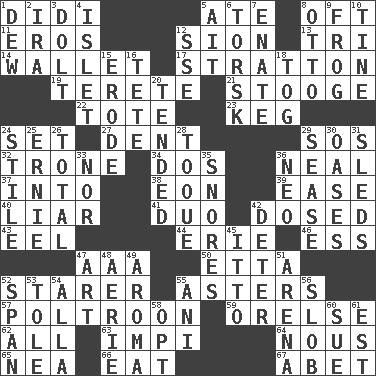 ACROSS 1. "You Light Up My Life" star Conn 5. Had dinner 8. Often (poetically) 11. Greek god of love 12. The Jewish people; Israel 13. Three (prefix) 14. Place for singles 17. Ski resort town in Vermont 19. Cylindrical with tapered ends 21. Moe Howard, for one 22. Carry 23. Barrel 24. Put into a specified state 27. Scratch 29. Distress signal 32. Marketplace scale 34. Two (Sp.) 36. Anneal 37. To the inside or interior of 38. Age 39. Relaxation 40. One who doesn't tell the truth 41. Superhero pair 42. Administered medicine 43. Snakelike fish 44. One of the Great Lakes 46. Double-curved letter 47. Auto club (abbr.) 50. Singer James 52. A viewer who gazes fixedly 55. Michaelmas daisies 57. Coward 59. Threatening words 62. 100% 63. Body of Kaffir warriors 64. Good sense 65. Teachers' org. 66. Consume 67. Collude with DOWN 1. Morning condensation 2. Lyricist Gershwin 3. Dunce 4. Small island 5. Small island 6. Cod relative 7. Related on the mother's side 8. "Beetle Bailey" pooch 9. Tree-dwelling hopper 10. Prong on a fork 12. Compass dir. 15. Wear away 16. Wig 18. Coat; cloak 20. Looked after 24. Vertical member of a panel or frame 25. Bert's buddy 26. "_____ Recall" 28. Woman's close-fitting hat 29. Gospel singer Marvin 30. Fertile tracts in a desert 31. Bobsleighs 33. Not either 35. Sounds asleep 36. Modern: prefix 42. Prevent from occurring 45. "Tell ____ the Marines!" 47. Nonscientific branch of learning 48. Nest on high 49. Scent 51. Sports stadium 52. Connect, as a bridge 53. Lacquered or enameled metalware 54. Silent film actress Nazimova 55. Black tropical American cuckoo 56. Oscar Madison type 58. Choose 60. Take to court 61. Eastern Standard Time (abbr.)