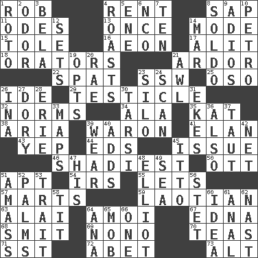 ACROSS 1. Director Reiner 4. Monthly bill 8. Plant excrement 11. Lyric poems 13. Single time 14. Method 15. Lacquered or enameled metalware 16. Age 17. Came down and settled, as after flight 18. Speakers 21. Zeal 22. Petty quarrel 23. Compass dir. 25. Bear (Spanish) 26. Binary compound 29. A testis 32. Typical models 34. In the manner of 35. Krazy ___ of comics 38. Operatic vocal solo 39. Make _____ (do battle with) 41. Style 43. Slangy assent 44. Begley and Asner 45. Come out of 46. Most dubious of character or honesty 50. Baseball player Mel 51. Fitting 54. Big collection agency 55. Allows 57. Shops 59. Of or relating to Laos or its people 63. Jai _ 64. Mine, in Marseilles 67. Pulitzer Prize-winning author Ferber 68. Stricken, poetically 69. Words to Nanette 70. Beverages made from leaves 71. Fast jet (abbr.) 72. Collude with 73. The first octave above the treble staff DOWN 1. Printing process, for short 2. Aroma 3. Actor Lugosi 4. Cooks with dry heat, as in an oven 5. Compass dir. 6. Non-commissioned officer (abbr.) 7. "___ Little Indians" 8. Twentieth part of a lira 9. Goodbye (Sp.) 10. Stone: prefix 12. Arranges properly for use 14. Impair 19. Elects 20. Actress Charlotte 21. Leather borer 23. Grain storage tower 24. Examine minutely or intensely 26. _ tizzy (2 wds.) 27. Rowboat 28. One of the Great Lakes 30. Tarsus (plural) 31. Makes supply last 33. Atlas contents 36. In addition 37. Drawn tight 39. Erode 40. Sums up 42. Fish or hair follower 45. "Tell ____ the Marines!" 47. Part of HMS, perhaps 48. American author Paul (1891-1958) 49. Ocean 51. Collect or gather 52. Insides of hands 53. Distinguishing feature 56. Proofreading order 58. Teat (slang) 60. It may be bright or harebrained 61. Of or related to the anus 62. Political cartoonist Thomas 64. Santa ___, CA 65. Crowd into 66. Single