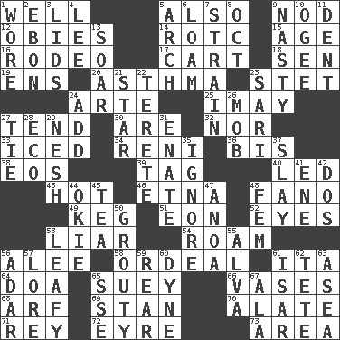 ACROSS 1. Not ill 5. In addition 9. Dreamland 12. Off-Broadway awards 14. College mil. group 15. Ripen 16. Cowboy competition 17. Draw slowly or heavily 18. Elected rep. 19. Followers of ems 20. Respiratory problem 23. Proofreading order 24. Johnson of "Laugh-In" 25. "If ____ say so..." 27. Look after 30. "We ___ not amused" (Victoria) 32. And not 33. On the rocks 34. Painter Guido (1575-1642) 36. Altar cloth linen 38. Greek goddess of the dawn 39. Label 40. Directed 43. Being at a high temperature 46. Inactive volcano in Sicily 48. Papal veil 49. Cask 51. Period of immesurable duration 52. Snake ____ (dice throw) 53. One who doesn't tell the truth 54. Wander 56. Toward shelter 58. Severe or trying experience 61. Call ___ day 64. ___ good deed 65. Chop _ 66. Flower holders 68. Sandy's bark 69. Comedian Laurel of Laurel & Hardy 70. Having winglike extensions 71. Marina Del _, California 72. Jane of fiction 73. Type of rug DOWN 1. Had on 2. Inky black, to poets 3. Flaplike coverings 4. Area sheltered from the wind 5. Bowlike part 6. Rich soil 7. Put through a sieve 8. Sep. follower 9. Difficult 10. Double curve, resembling the letter S 11. Gouge 13. Fly high 21. Play the lead 22. Cylindrical with tapered ends 23. Indian skirt 24. Say or write further 26. Crowd into 27. Neckwear 28. Environmental prefix 29. Delicate 31. Related on the mother's side 35. Fail to notice 37. Kill 41. Compass dir. 42. Two (Sp.) 44. Migrant worker of the '30s 45. Beverage made from leaves 47. Small Philippine buffalo 48. Opposite of masc. 50. Sullen 53. Like summer trees 55. Inventor's middle name 56. The sixth month of the Jewish calendar 57. Old wives' tales, e.g. 59. Tail end 60. Unit of force 61. Astrian river, tributary to the Danube 62. Wig 63. At sea 65. Compass dir. 67. Chicken ___ king