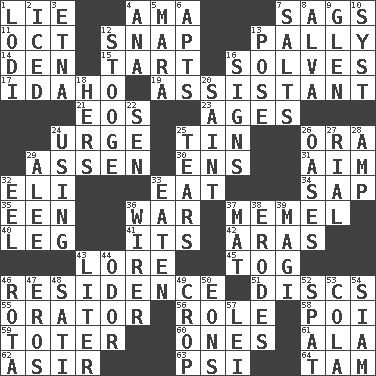 ACROSS 1. Whopper 4. Wet nurse (var.) 7. Settles 11. Sep. follower 12. Fastener 13. Friendly 14. Lair 15. Small pie 16. Finds the solution 17. Potato state 19. Aide 21. Greek goddess of the dawn 23. Ripens 24. Goad 25. Metal container 26. Mouth or opening 29. NE Netherlands city 30. Followers of ems 31. Direct toward a target or goal 32. Connecticut Ivy Leaguer 33. Ingest 34. Plant excrement 35. Car or cant ending 36. Armed conflict 37. Klaipeda city 40. Part of a journey 41. It is 42. Caspian sea tributary 43. Old wives' tales, e.g. 45. Coat; cloak 46. Home 51. Plates 55. Speaker 56. Hero or heavy, e.g. 58. Luau course 59. Carrier 60. Washington bills 61. Chicken ___ king 62. SW Saudi Arabia district 63. 23rd letter of the Greek alphabet 64. Scottish cap DOWN 1. Farming town in central California 2. On the rocks 3. Inactive volcano in Sicily 4. Santa ___, CA 5. Hindu Mythology: god of death 6. Flats, for short 7. Table seasonings 8. Inventor's middle name 9. Small, secluded valley 10. System (abbr.) 12. Moe Howard, for one 13. Airs 16. Signals 18. Possessive pronoun 20. Virtuous person 22. Elected rep. 24. Exploiting 25. Separates forcefully 26. Fertile tracts in a desert 27. Monetary unit of Yemen 28. Electrical Unit 29. Toward shelter 32. Snakelike fish 33. Ingested 36. One who wires 37. Floor covering 38. Eats (away) 39. Wise men 43. 61 cubic inches 44. Aroma 46. Roll call or roster of names 47. Greek god of love 48. Suttee (variant) 49. Riding implement 50. Immeasurably long periods of time 52. Argument over a trivial matter 53. Root beer relative 54. Thailand, formerly 57. Luau accessory