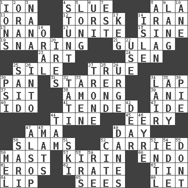 ACROSS 1. Electrically charged atom 4. Turn sharply 8. Chicken ___ king 11. Mouth or opening 12. Cod relative 14. SW Asia republic 15. Billionth: prefix 17. Join together 18. Trig term 19. Catching in a trap 21. Russian prison camp 23. Tate display 24. Elected rep. 25. Drop; flow; fall 27. Loyal 30. Baking dish 31. A viewer who gazes fixedly 34. Infant locale 37. Be seated 38. Amid 39. Cuckoo 40. Wedding promise 41. Looked after 43. Binary compound 44. Prong on a fork 45. Suggestive of the supernatural 47. Housemaid (var.) 49. 24 hours 50. Shuts with force 52. Borne 56. Vertical spar for supporting sails 57. Japanese brewing company 60. Inside; within (prefix) 61. Greek god of love 62. Feeling or showing extreme anger 63. Metal container 64. Mouth edge 65. Observes 66. Allow DOWN 1. Charged atoms 2. NW Algerian seaport 3. Nanny 4. Difficult or unusual or dangerous feat 5. Yearn 6. RI univ. 7. Eastern Standard Time (abbr.) 8. Believer in; advocate of (suffix) 9. Austrian-born American filmmaker Fritz 10. A saturated hydrocarbon 13. Barrel 14. Capri or Wright 16. Taken by mouth 20. Angers 22. Purpose 25. Expressed in words 26. To the inside or interior of 27. Heavy duty weighing machine 28. Tear apart 29. Goad 30. Air pressure measure (abbr.) 32. Jacques of French films 33. So be it 34. Den 35. "60 Minutes" Commentator Rooney 36. Sliced dessert 42. Letter starter 44. Scottish cap 46. Jane of fiction 47. Columnist Joseph or Stewart 48. Floor coverings 49. Natives or inhabitants of Denmark 50. Indian skirt 51. What Jean-Claude Killy likes to do 52. Quote 53. International (abbr.) 54. Singer Brickell 55. Do not 56. Cartoonist voice _ Blanc 58. Big collection agency 59. Actress Charlotte