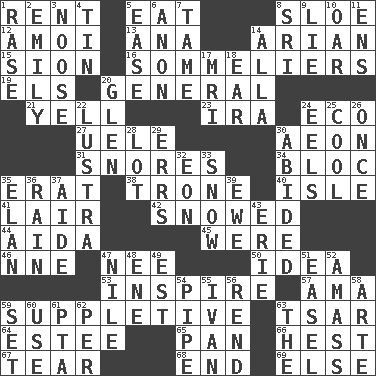 ACROSS 1. Monthly bill 5. Erode 8. _ gin 12. Mine, in Marseilles 13. Santa ___, CA 14. Believer in; advocate of (suffix) 15. The Jewish people; Israel 16. Wine waiters 19. Raised railways 20. Commissioned military rank 21. Shout 23. Retirement account (abbr.) 24. Environmental prefix 27. Ubangi River tributary 30. Age 31. Sounds asleep 34. Group of countries in special alliance 35. Part of Q.E.F. 38. Heavy duty weighing machine 40. Capri or Wright 41. Den 42. Overwhelmed 44. Opera by Verdi 45. We are 46. Compass dir. 47. Born 50. The main thing one is thinking about 53. Heighten or intensify 57. Nanny (var.) 59. Supplying deficiencies 63. Russian ruler of old 64. First name in cosmetics 65. Baking dish 66. Behest 67. Rend 68. Conclude 69. Otherwise DOWN 1. Raze (variant) 2. Poet Dickinson 3. Trap for birds or small mammals 4. Shallow baking pan 5. Relaxation 6. Soon (poet.) 7. Not wild 8. _ Lanka 9. Whopper 10. Boat paddle 11. Followers of ems 14. Silent film actress Nazimova 17. Medical imaging device (abbr.) 18. Ewer handle 20. Small, secluded valley 22. A period of five years 24. Snakelike fish 25. Calm and collected 26. At one time in the past 28. Car dealer's back yard 29. Blunders 30. Stayed 32. Age 33. Overwhelm 35. Enthusiasm 36. Water falling in drops from the sky 37. Assistant 39. She-sheep 43. 4th largest of the Great Lakes 47. "Death on the ____" 48. Compass dir. 49. Eastern Standard Time (abbr.) 51. Artist's stand 52. Collect or gather 54. Corncob 55. _ the terrible 56. Tear apart 58. Johnson of "Laugh-In" 59. Put into a specified state 60. Purpose 61. Parent Teacher Assoc. 62. For each 63. Definite Article